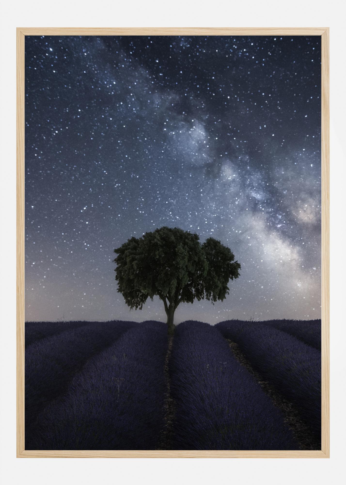 Poster svemira s zvjezdanim nebom gdje Mliječni put svijetli iznad usamljenog stabla. Linije lavande vode put do stabla koje stoji samo protiv plavog horizonta. Galaksija presijeca poster iznad stabla i privlači pogled na nebo iznad, stvarajući čaroban i epski osjećaj.