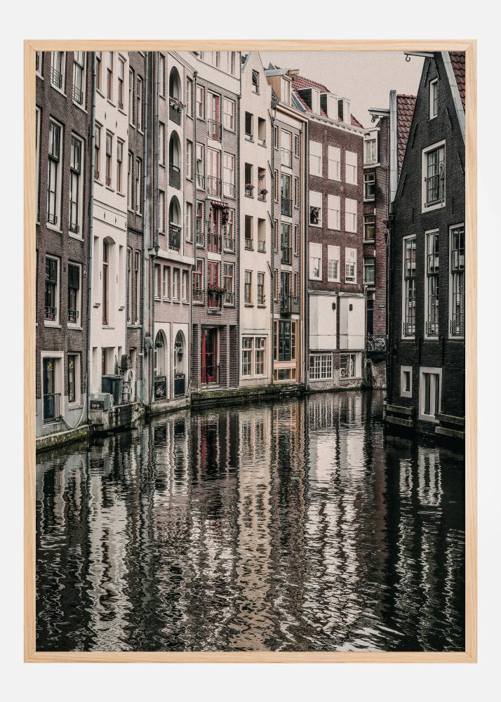 Poster s gradskim prizorom s kanalom koji prolazi kroz redove visokih gradskih kuća. Ovaj sepiotisak ima samo nekoliko nijansi crvene i mekih smeđih boja kako bi stvorio fokalne točke. Kuće su smještene uz obalu i bacaju sjene na pjenušavu površinu. Pronađite odgovarajuće bež nijanse za zid kako bi boje kuća bile naglašenije.