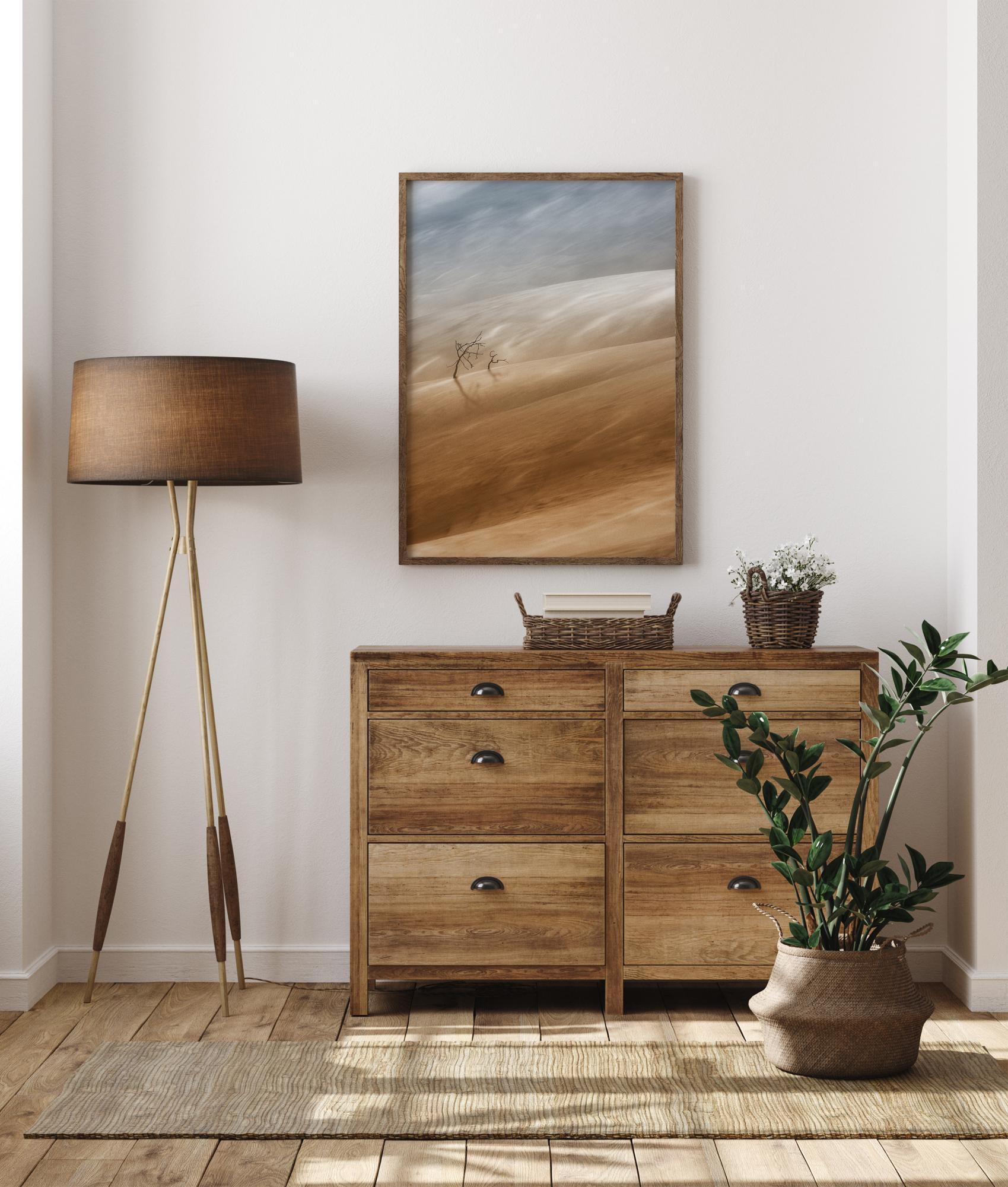 Prostrani pogled na pustinju s dva usamljena stabla. Mekane pastelne žute i plave boje stvaraju harmonično središte pažnje za svaku sobu u kući. Neka vas ponese ovaj fantastični prizor.