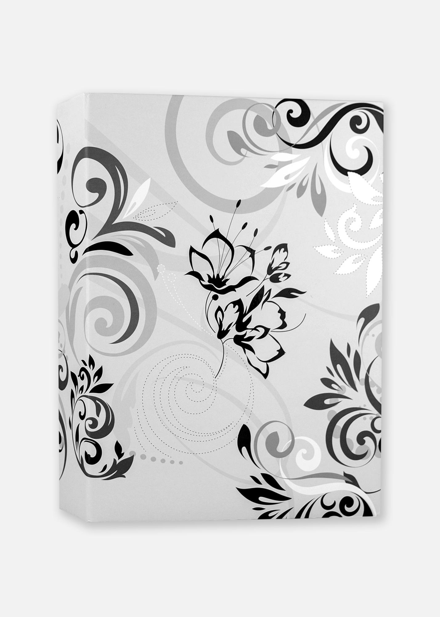 Album ima čvrste korice sa stilskim cvjetnim uzorkom u crnoj i sivoj boji. To je dekorativni fotoalbum koji izgleda lijepo i na polici i postavljen na vidljivo mjesto.