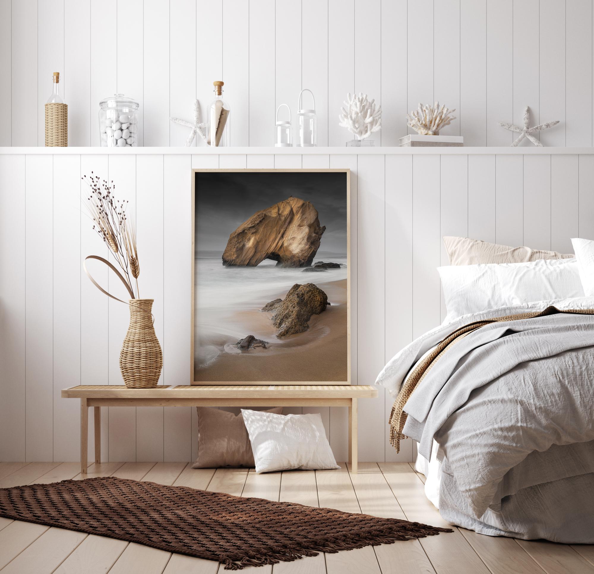 Dramatičan poster s plažom i stijenama ispod olujnog neba. Bijeli morski valovi vrtlože se prema plaži oko snažne pješčane stijene usred mora. Mekana i neizoštrena slika ublažava potencijalnu oluju i stvara mirniju atmosferu u vašem domu.