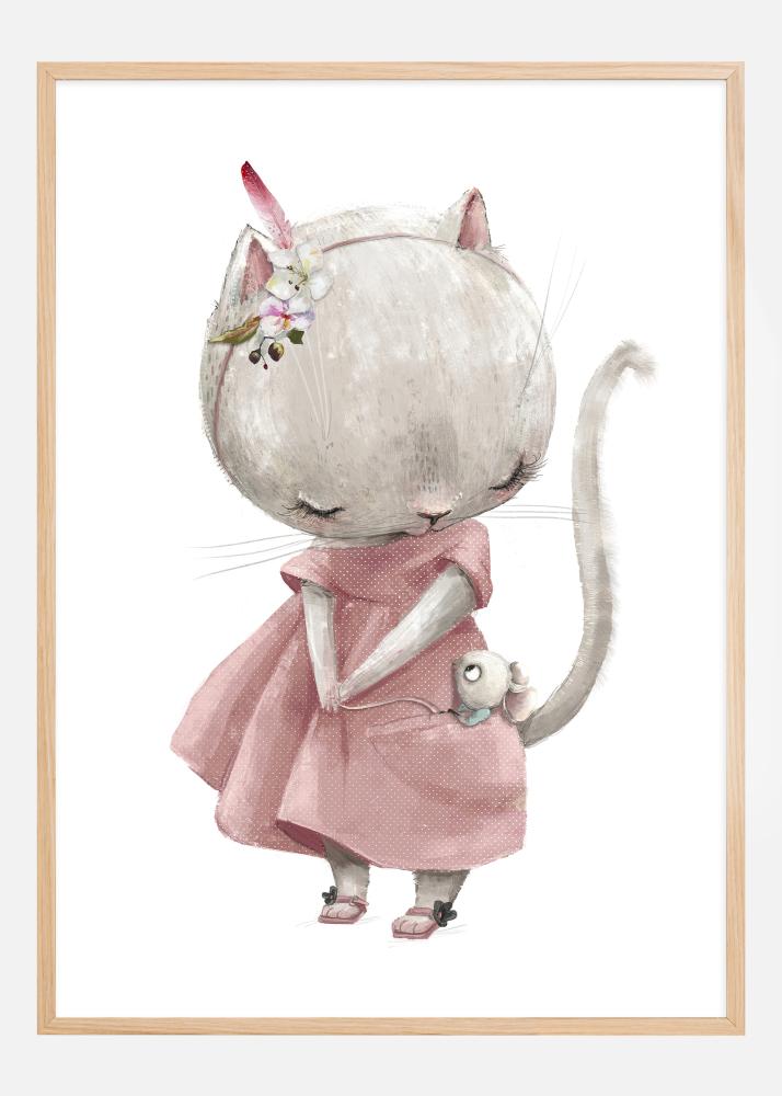 Ovaj očaravajući poster prikazuje slatku scenu neobičnog prijateljstva; mali miš koji sigurno odmara u naručju mačke, oboje odjeveni u svečanu odjeću. Mačka je lijepo obučena u ružičastu haljinu, kompletiranu s elegantnim cvjetnim ukrasom na glavi. Lijepa akvarelna slika daje životinjama mekoću i toplinu koja zrači prijateljstvom i povjerenjem.