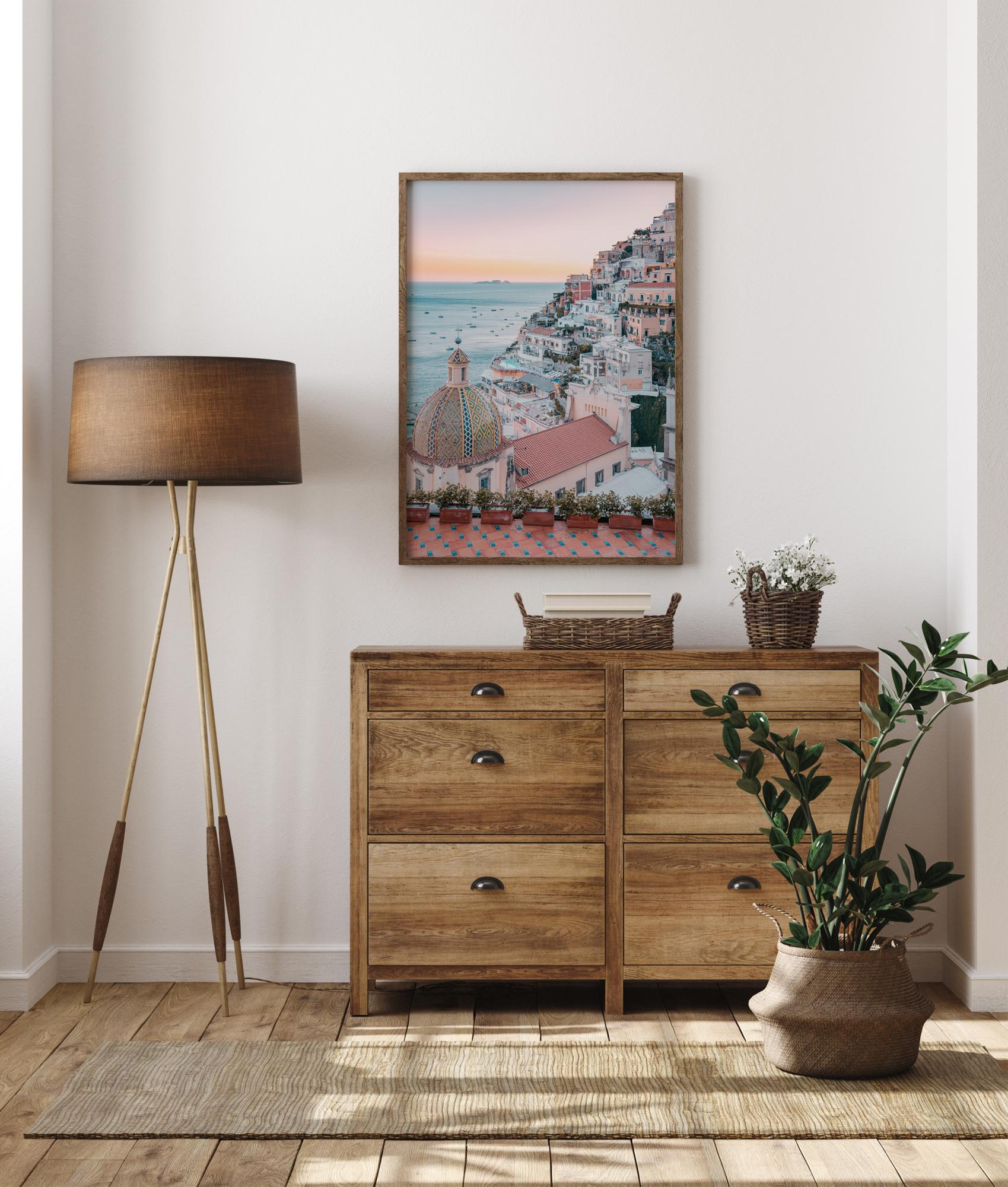 Putni poster s gradom uz more. Mekane bijele i pastelno obojene kuće stvaraju osjećaj odmora u ovom mediteranskom okolišu. Svijetloplavo more se pruža daleko i ispunjeno je malim ribarskim brodicama. Izlazak sunca vidljiv je upravo na horizontu i baca toplo svjetlo preko slike.