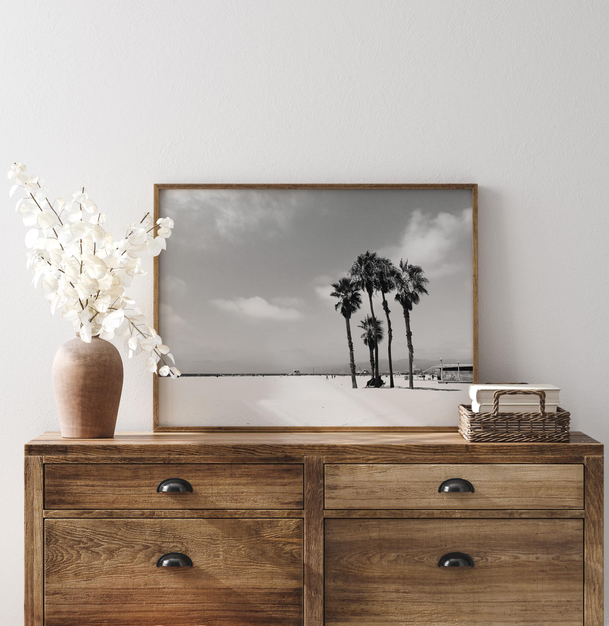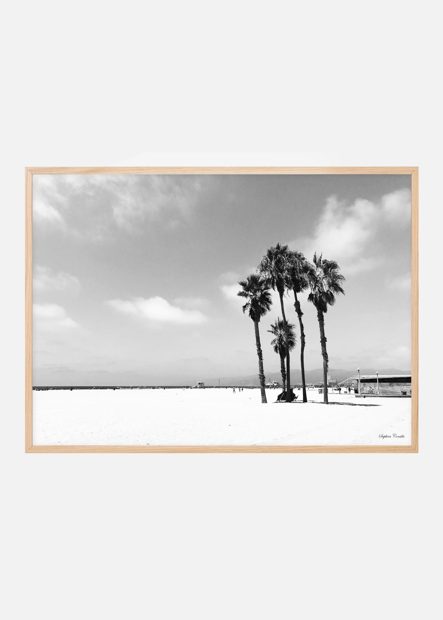 Ovdje nas fotografkinja Saphira Consilio vodi na bijelu plažu u Veneciji. Ovdje ljudi dijele mjesto s prekrasnim palmama, zabavnim parkovima i tornjevima za spašavanje spasilaca. Lijep crno-bijeli poster u vodoravnom formatu.