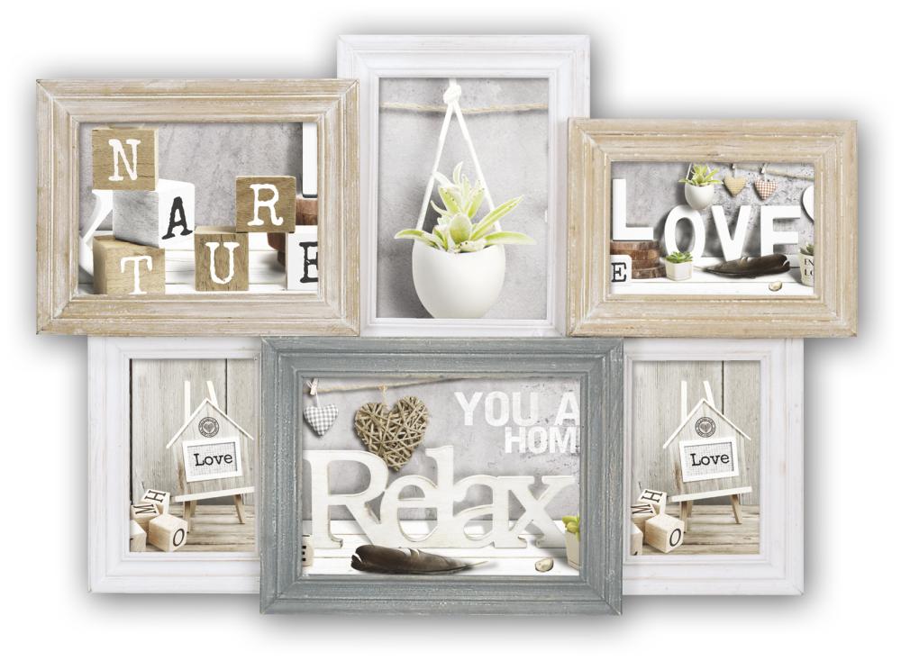 Neka ovaj šarmantni kolaž okvir unese prirodan i opušten osjećaj u vaš dom! Okvir ima mjesta za 6 slika u različitim formatima. Letvice su u boji drveta, sivoj i bijeloj s istrošenim detaljima.