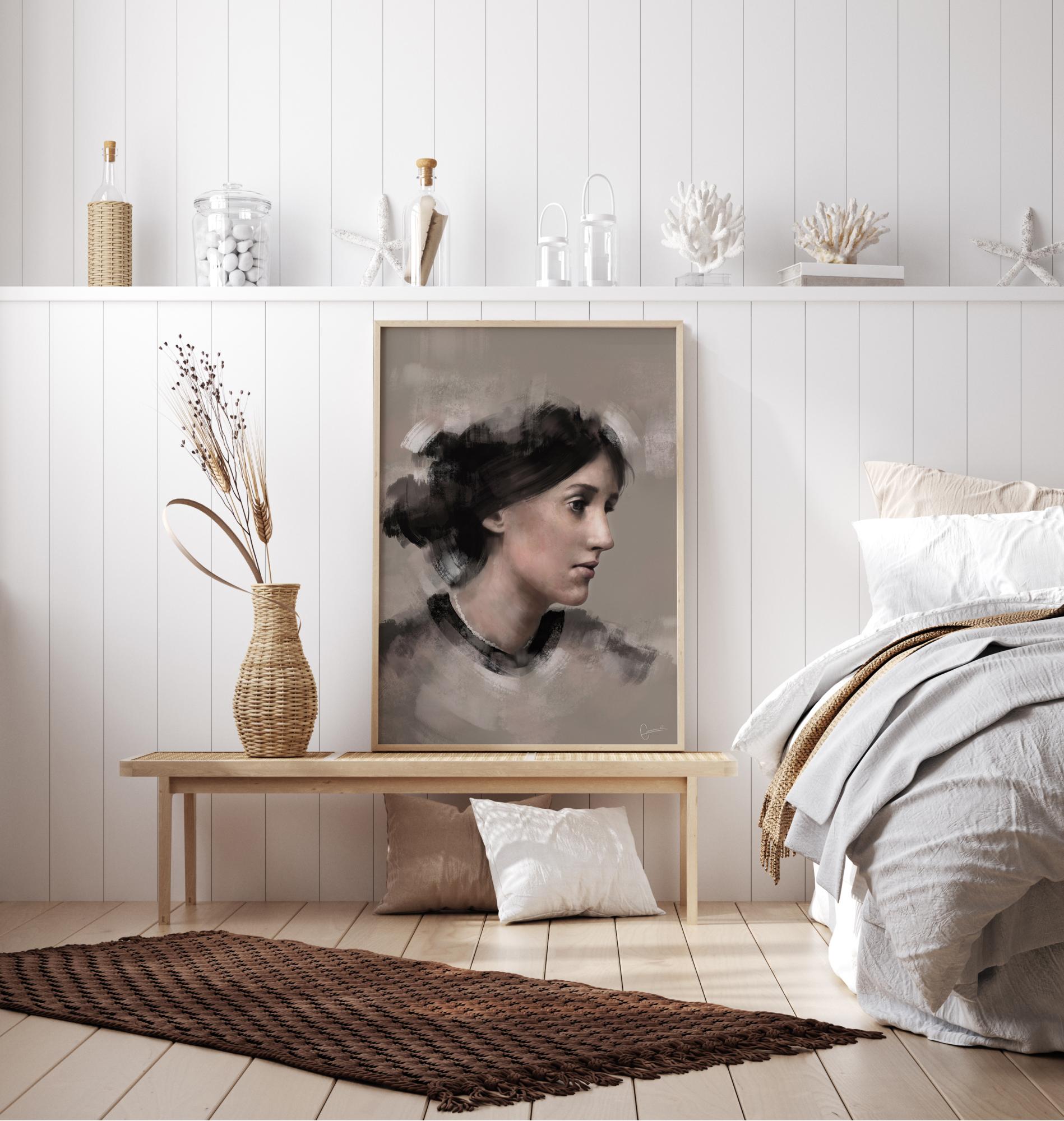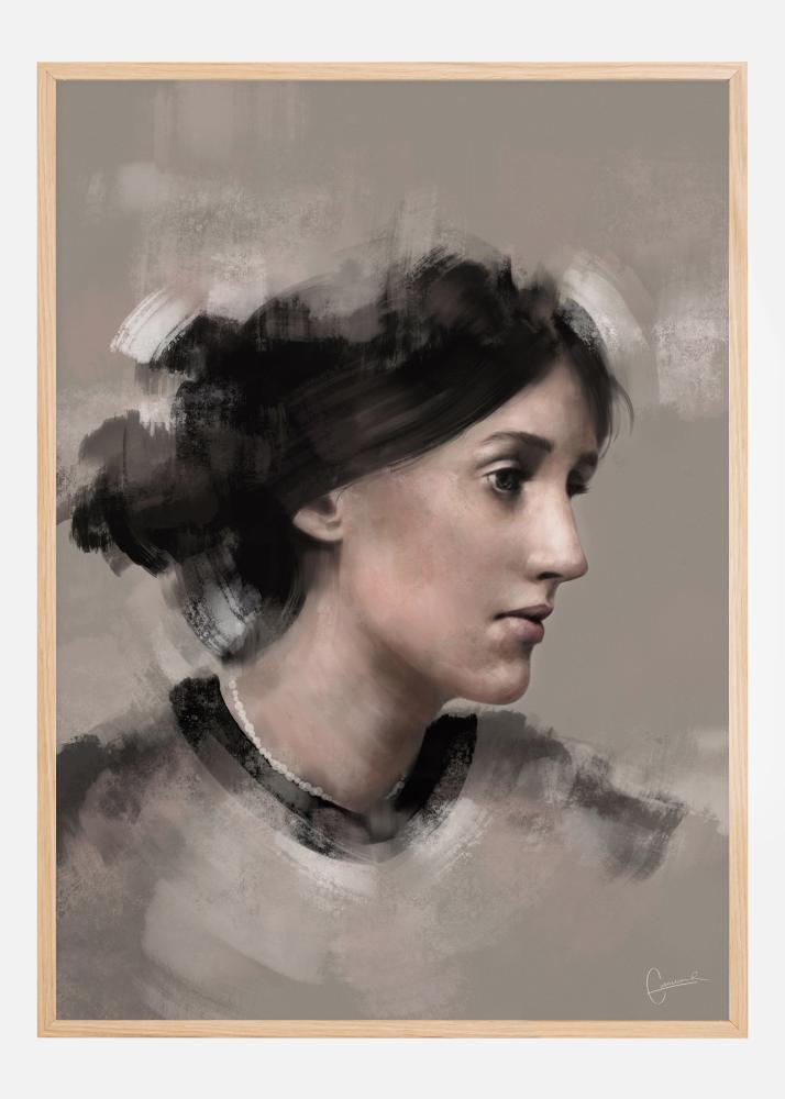 Poster portret s Virginijom Woolf u profilu. Njezina kosa su jednostavne mekane mrlje boje, ali njezino lice je prikazano s pažljivim detaljima. Portret je nježan i ženstven i daje gotovo melankoličan ton njezinom licu dok gleda u daljinu.