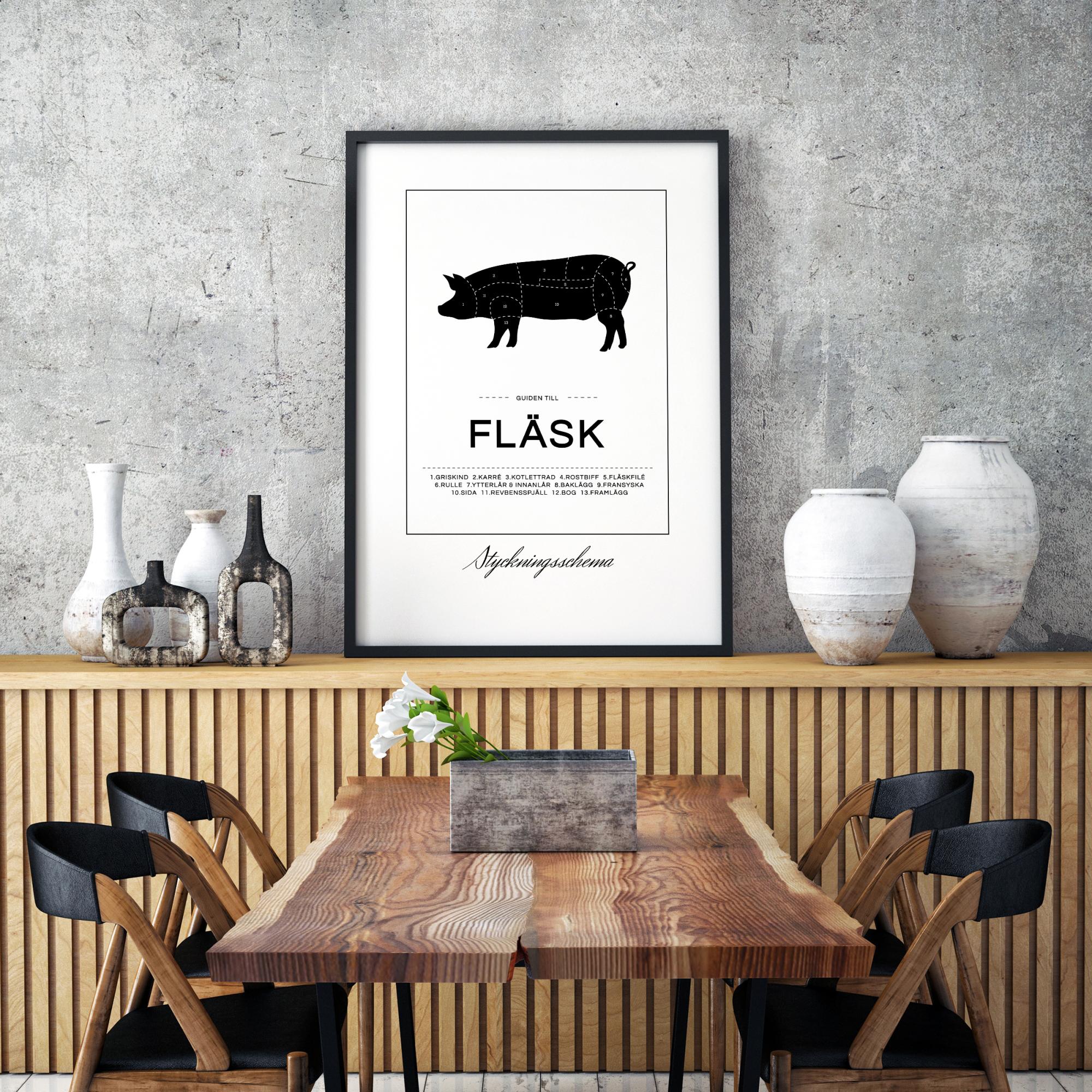 Nije samo mesarima dopuÅ¡teno da stave lijep prikaz rasporeda rezanja na zid. Ovdje imamo crno-bijeli poster s printom koji prikazuje svinju s oznakama koje pokazuju gdje možete pronaÄi razne svinjske delicije. Ispod svinje je tiskan tekst "VodiÄ za svinjetinu" zajedno s urednim popisom dijelova svinje. Tekstualni dijelovi su odvojeni s dvije crtkaste linije, a motiv je uokviren jednostavnim kvadratom. Ispod kvadrata stoji tekst "Prikaz rezanja" napisan ukrasnim fontom.