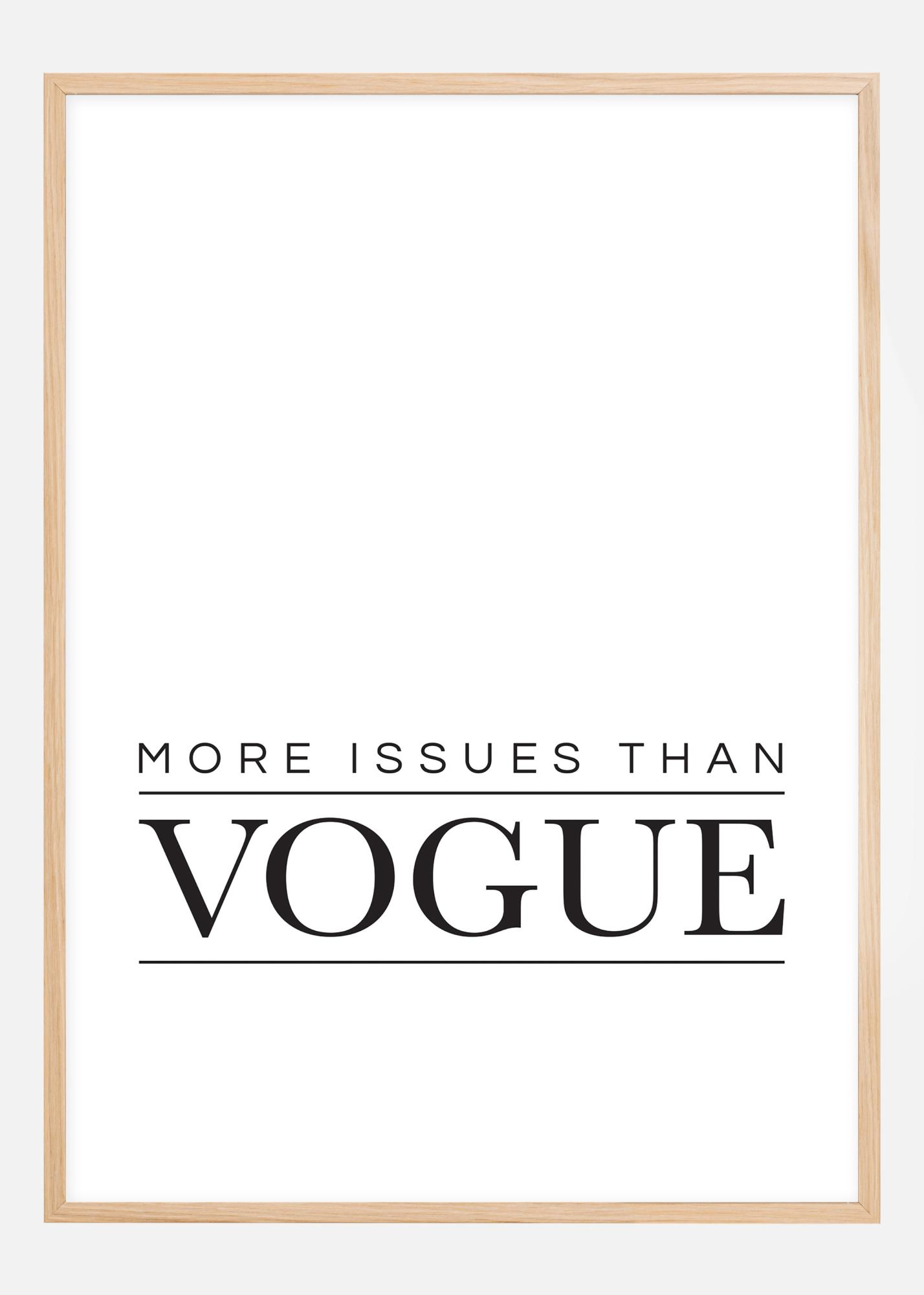 Stvorite prekrasan zid s plakatima u domu s elegantnim posterima u raznim izvedbama! Ovdje imamo elegantan crno-bijeli plakat s motivom u obliku teksta "More issues than Vogue" zajedno s dvije dekorativne linije. Riječ "Vogue" napisana je fontom koji podsjeća na logotip velikog modnog časopisa. Uskladite ga s okvirom zlatne ili srebrne boje za luksuzan dojam. Budući da poster dolazi u nekoliko različitih veličina, lako ćete pronaći onaj koji odgovara baš vašem zidu.