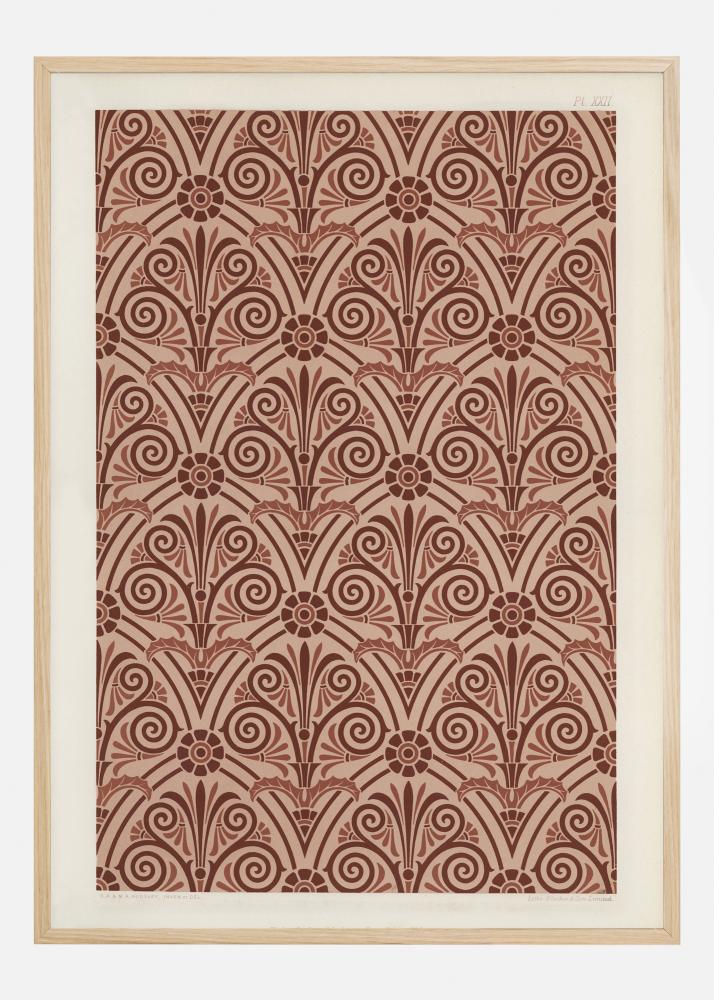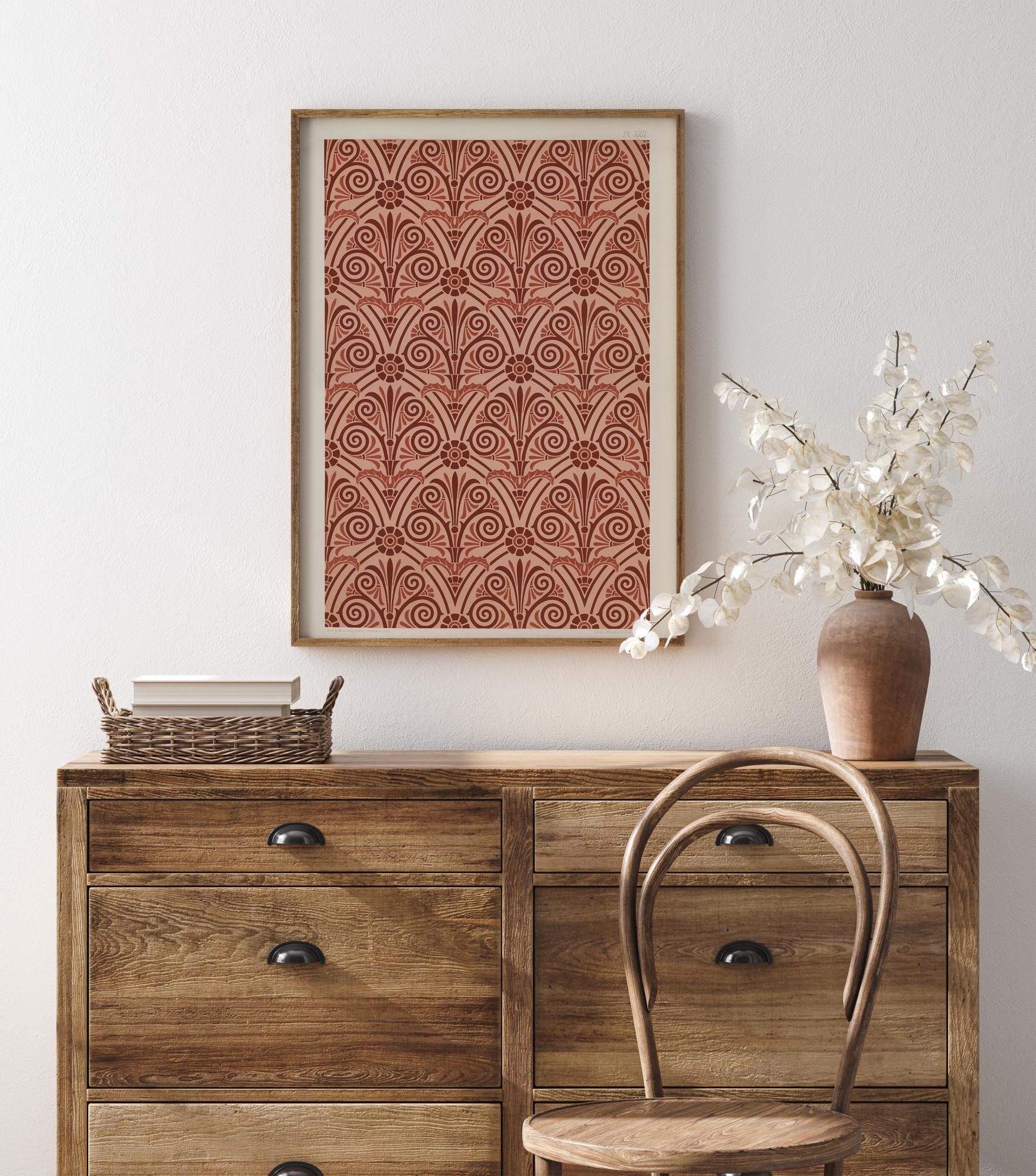 Svijetlo uzorak plakat s crvenim ponavljajućim uzorcima. Unutar uzoraka nalaze se kovrčavi krugovi koji izgledaju kao listovi ili resice. Tu su i cvjetni oblici u redovitim razmacima, što ovo čini botaničkim uzorkom ispisa. Savršeno za tapeciranje, pogledajte koje slike vidite u ovim zamršenim uzorcima.