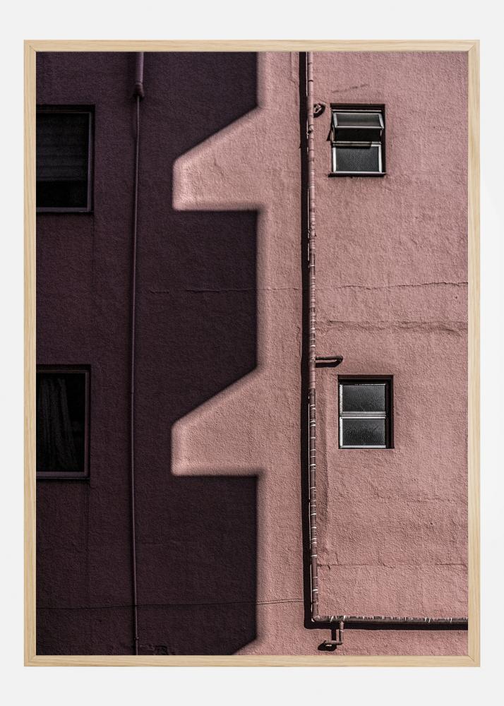 Poster s građevinom s vanjske strane tamnoružičaste zgrade. Sjene i svjetlost bacaju neobične oblike na stranu zgrade. Prozori izgledaju kao oči, u skladu sa sjenama koje nalikuju na noseve, pa se čini da te ova slika promatra.