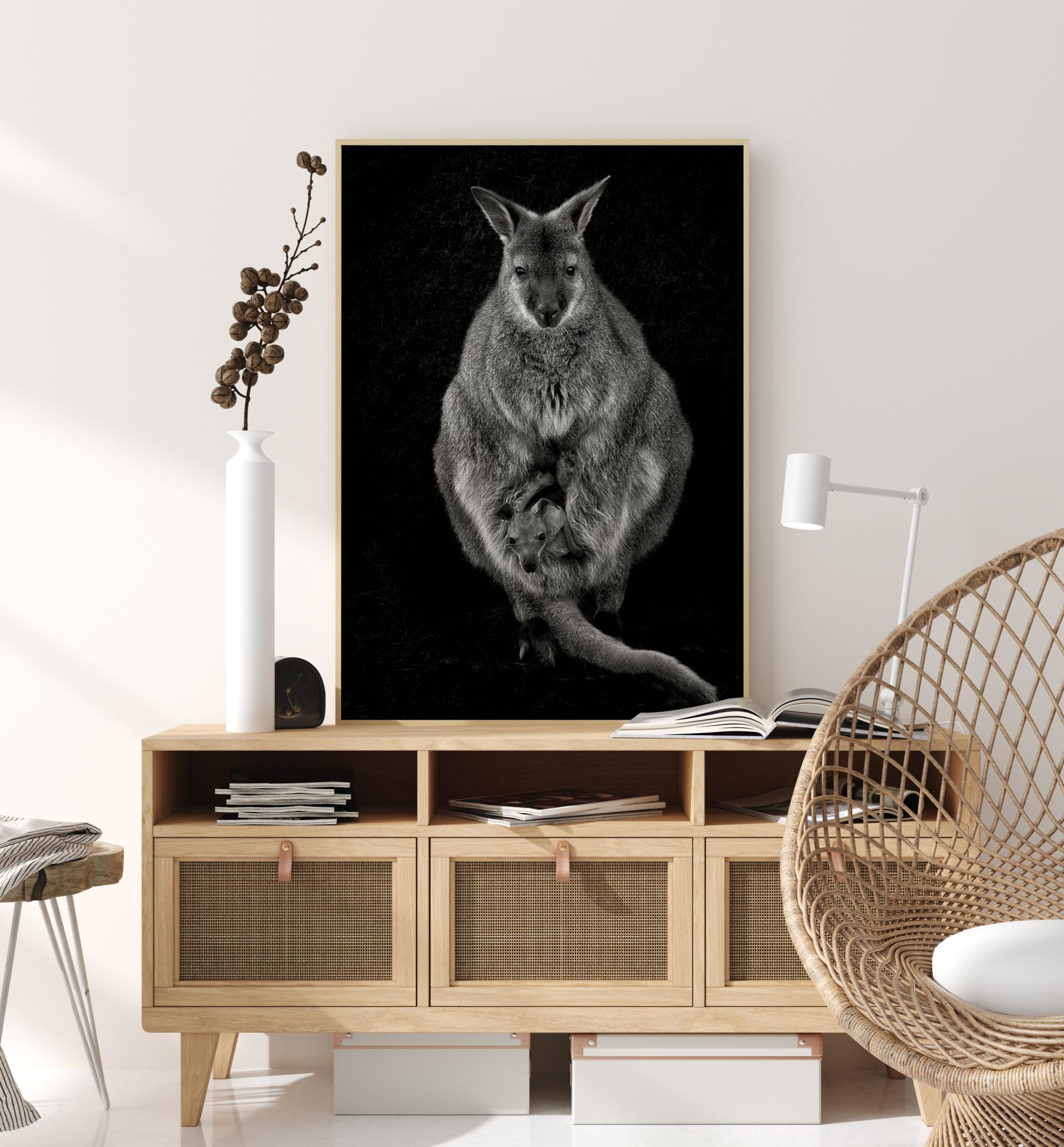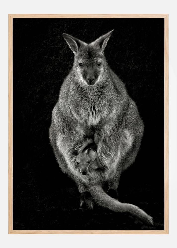 Plakat s motivom prirode s valabijem i njezinom bebom. Par se ističe na prekrasnoj slici protiv crne pozadine. Postignite taj sladak, nježan osjećaj kada gledate ovu majku i njezino dijete.