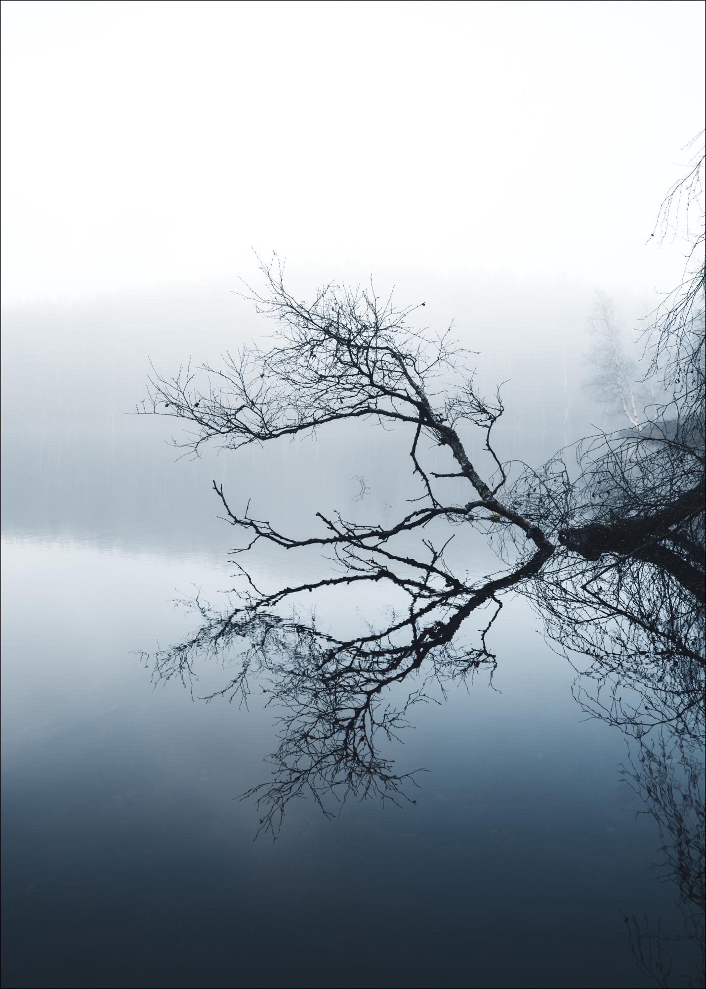 Bijeli poster sa širokim mirnim jezerom s mrtvim stablom koje se uzdiže iz vode. Kada se grana savija prema gore, baca svoj odraz na jezero i stvara prekrasnu zrcalnu sliku. Bijelo nebo iznad pomaže razlikovati stvarnu granu od njenog odraza. Plave nijanse daju hladniji osjećaj toplom zidu.