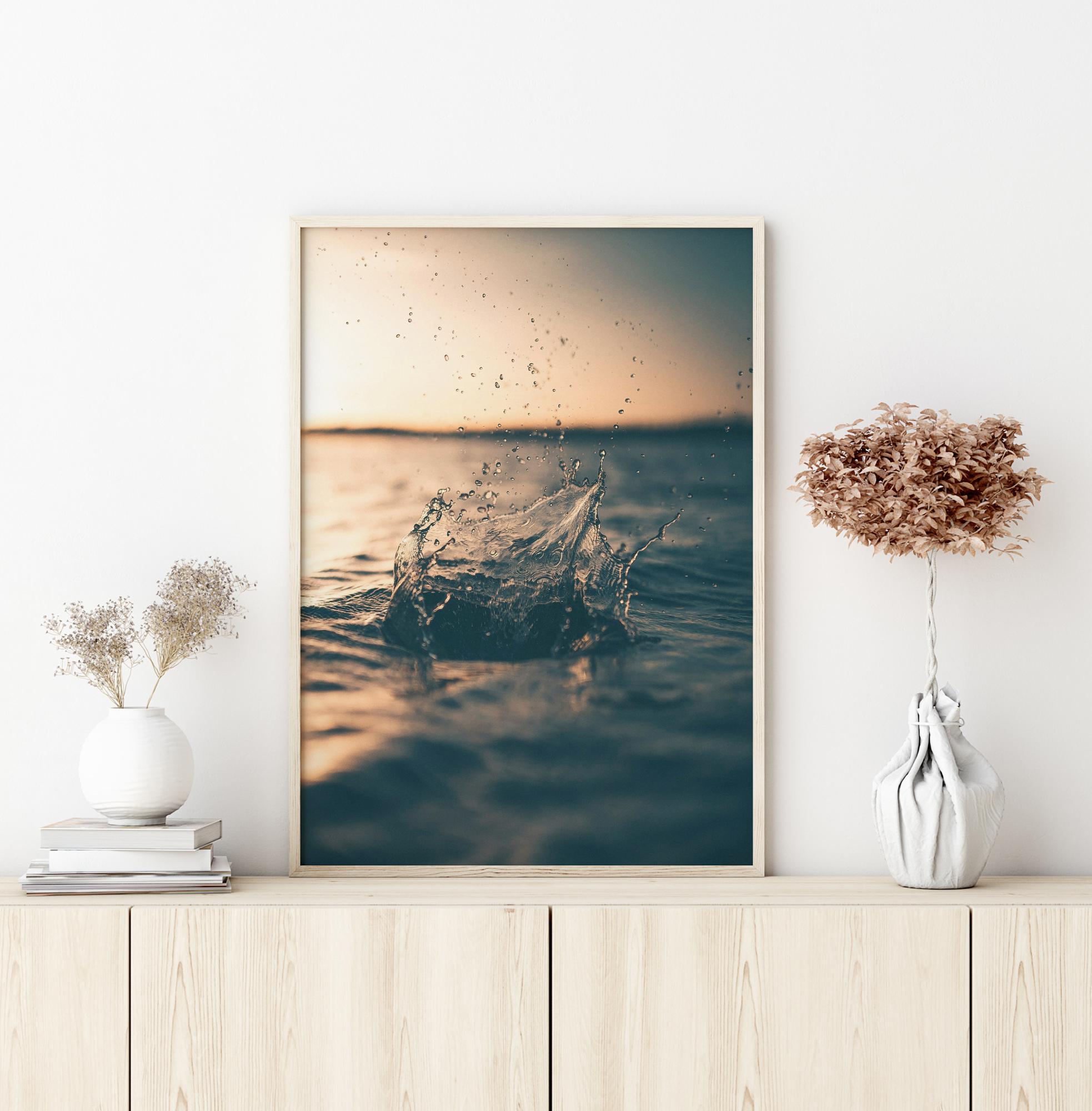 Plakat izbliza posljedica predmeta koji pada u lokvu vode. Rubovi prskanja poskakuju i stvaraju male kapljice u zraku. Sunce sije zdesna i osvjetljava scenu te hvata prskanje vode dok se diže. To je fascinantna slika.