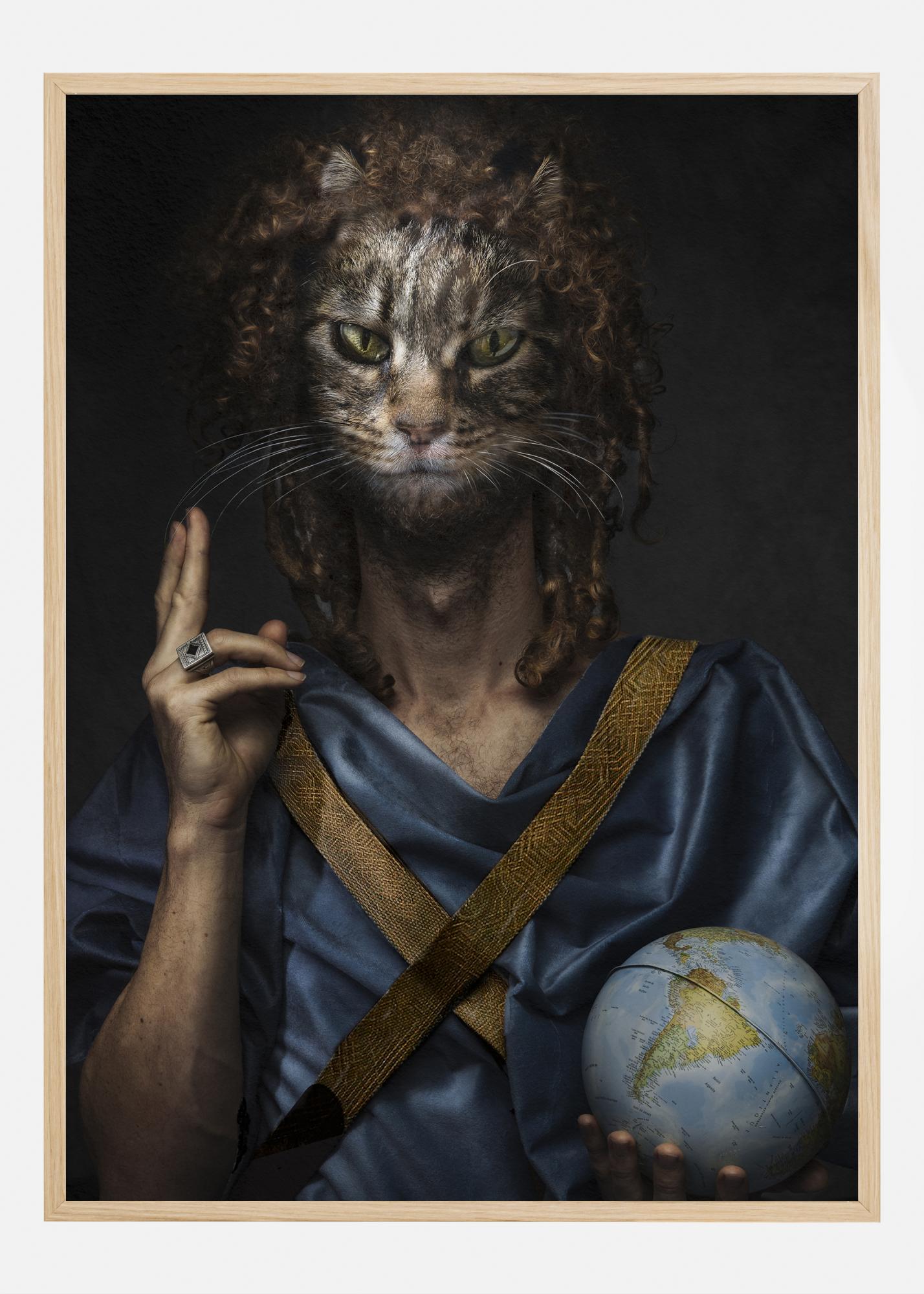 Ovaj jedinstveni poster prikazuje neobičnu i poticajnu sliku gdje je mačja glava postavljena na ljudsku figuru. Motif predstavlja duboku, tamnu pozadinu koja snažno kontrastira s figurinim svijetlim, oštrim pogledom. Ljudski dio figure odjeven je u bogatu plavu tuniku, obrubljenu zlatnim detaljima koji daju osjećaj elegancije i snage. Figura u ruci drži starinski globus, što dodaje dimenziju mudrosti i globalnog uvida. Na slici dominiraju boje poput tamnoplave, zlatne, te tonovi smeđe i bež koje se stapaju kako bi stvorile poster koji je i misteriozan i ikoničan.