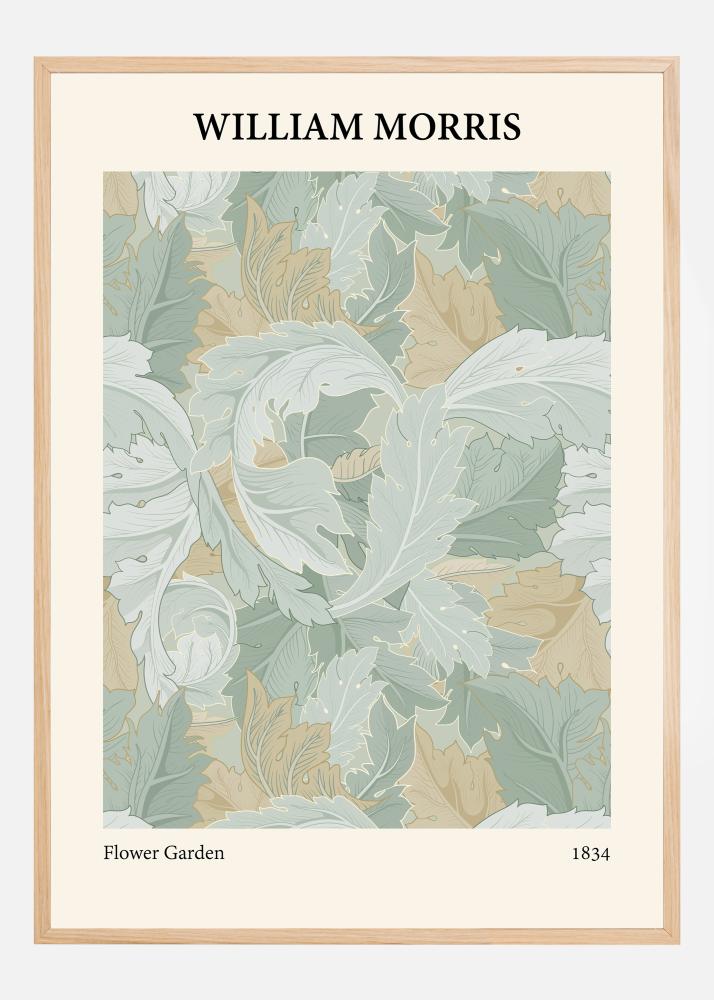 Ovaj elegantan i očaravajući plakat je posveta Williamu Morrisu i njegovom nezaboravnom doprinosu dizajnu i umjetnosti. S motivom "Cvjetna bašta", ovaj print predstavlja sofisticiranu kompoziciju lišća i cvjetnih oblika koji se isprepliću u paleti boja umirujućih plavo-zelenih i toplih bež tonova. Svaki element je oblikovan s Morrisovom karakterističnom pažnjom na detalje, stvarajući osjećaj dubine i složenosti koji se može cijeniti pri svakom pogledu.