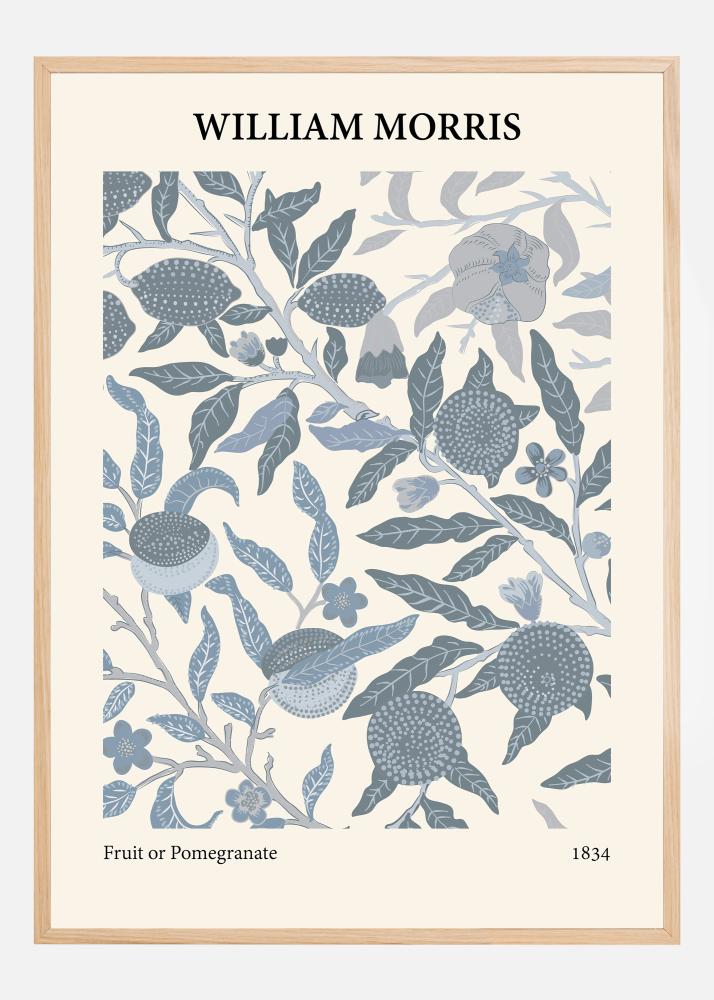 Ovaj detaljno izrađen i elegantan plakat prikazuje ikonički dizajn Williama Morrisa "Voće ili Nar", koji je ovdje prikazan s osvježavajućom i elegantnom paletom boja. Sofisticirani aranžman nara pomiješan s različitim oblicima lišća i cvijeća daje osjećaj živahne i bujne prirode. Suptilna paleta boja postera, s nijansama plave i sive na krem pozadini, ostavlja sofisticiran i suvremen dojam koji savršeno odgovara različitim stilovima uređenja.