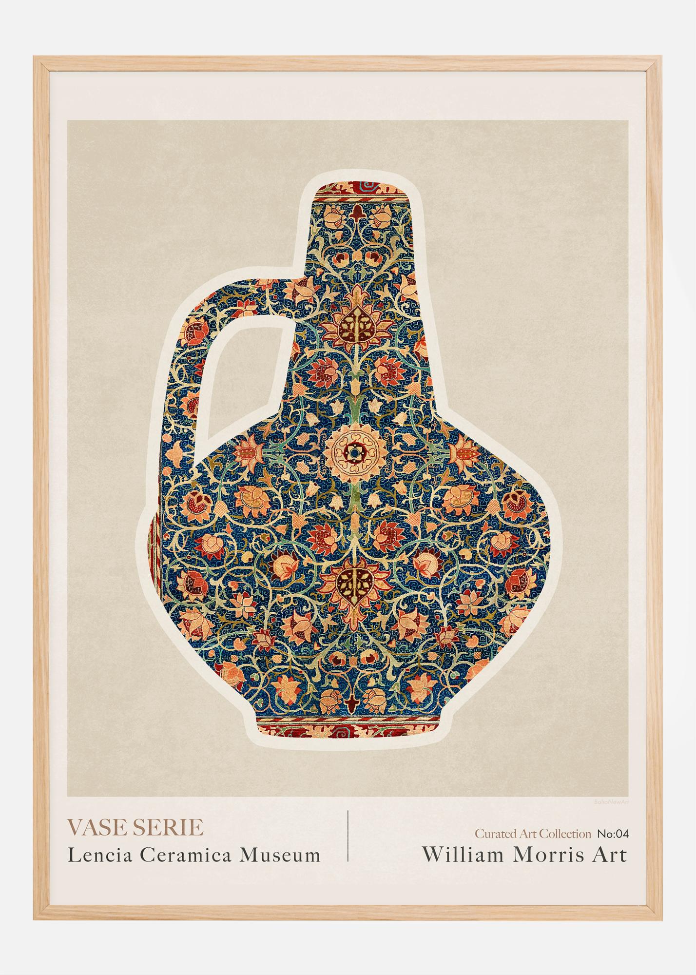 Ovaj poster, koji je broj 04 u "Curated Art Collection" iz Lencia Ceramica Museum, bogata je i složena počast Williamu Morrisu i njegovom značajnom doprinosu umjetnosti uzoraka. Ovdje je prikazana elegantna vaza, prekrivena detaljnim i šarenim uzorkom koji zrači viktorijanskom fascinacijom za orijentalnu i srednjovjekovnu umjetnost, stil koji je Morris pomogao popularizirati.