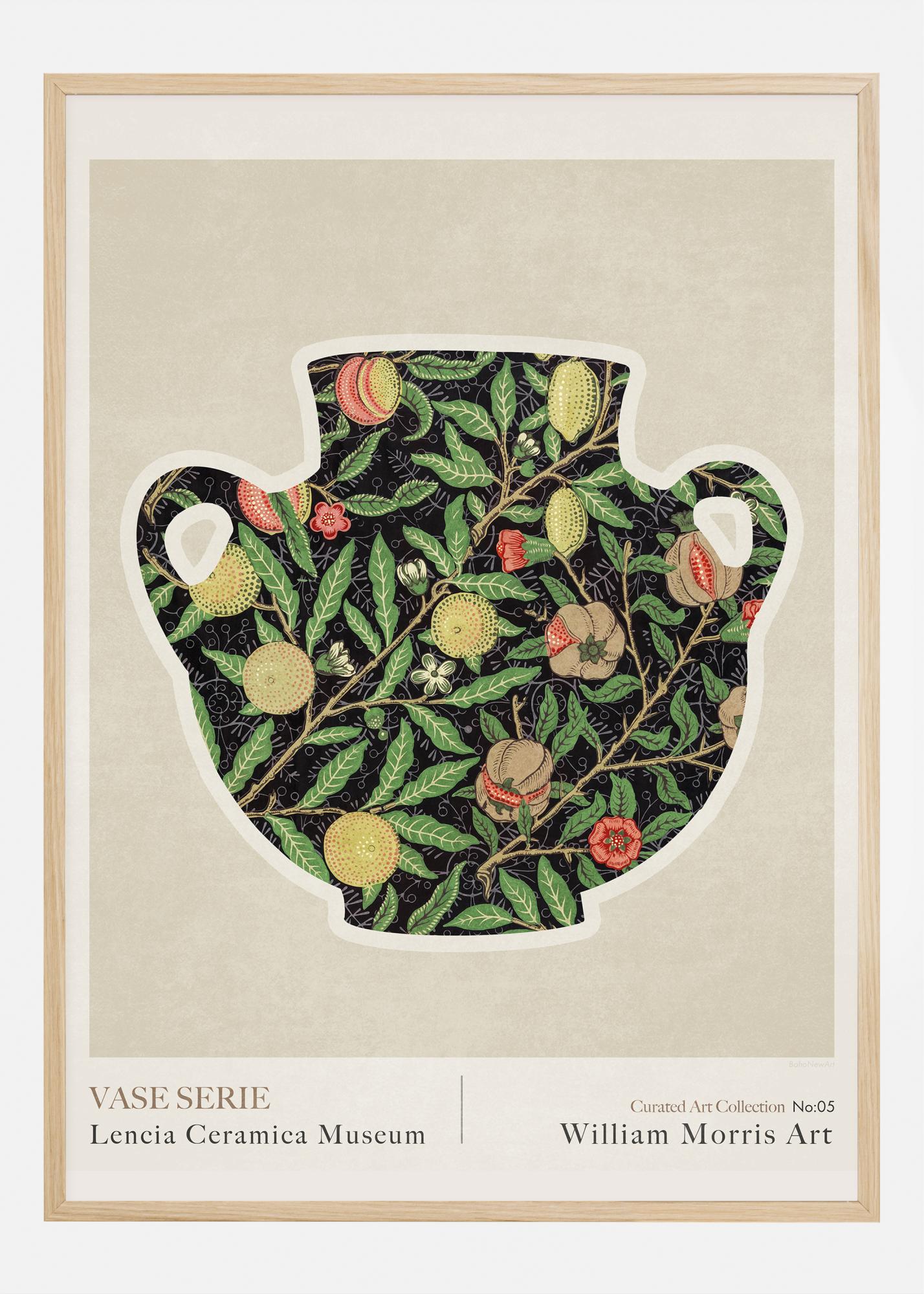 U ovom plakatu, broj 05 iz "Curated Art Collection" u Muzeju Lencia Ceramica, ponovno proživljavamo bezvremenski utjecaj Williama Morrisa u umjetnosti i dizajnu. Predstavljeno djelo je stilizirana vaza s intrikatnim uzorkom koja je ispunjena očaravajućom mješavinom botaničkih elemenata i motiva voća, što odražava Morrisovu strast prema prirodi i njegovu sposobnost da u svom radu povezuje oblike iz prirode.