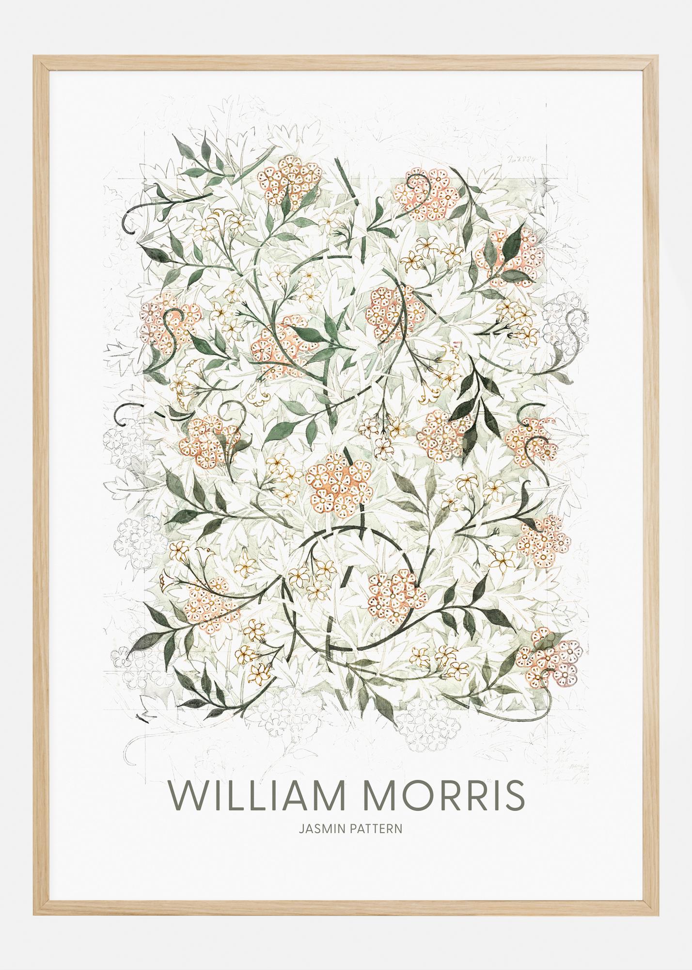Ovaj izvrsni poster prikazuje "Jasmin uzorak", još jedno bezvremensko djelo poznatog dizajnera Williama Morrisa. Uzorak je divna kompozicija jasminovih cvjetova i lišća, izrađena s finoćom i pažnjom na detalje koja je karakteristična za Morrisa. Shema boja je mekana i prirodna paleta, koja ističe delikatne oblike cvjetova i lišća na mirnoj pozadini.