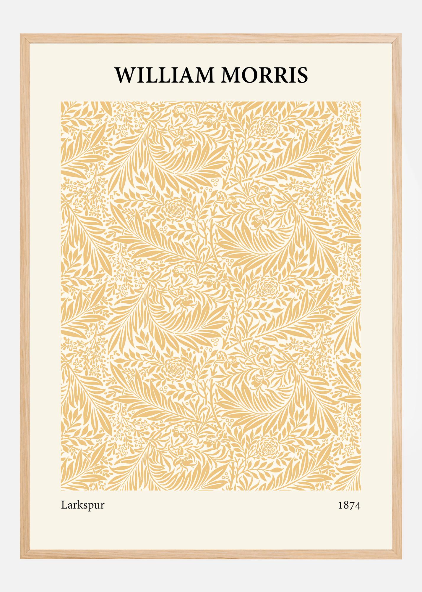 Svojom toplom, monokromatskom zlatnom nijansom, ovaj poster ponovno stvara raskošni dizajn "Larkspur" Williama Morrisa iz 1874. Bogata kompozicija lišća i cvijeća pleše preko papira, što ilustrira vještinu i preciznost po kojima je Morris poznat unutar pokreta umjetnosti i zanata. Ovaj poster donosi osjećaj topline i sunca u bilo koju prostoriju i prekrasna je posveta viktorijanskoj umjetnosti i obrtu.