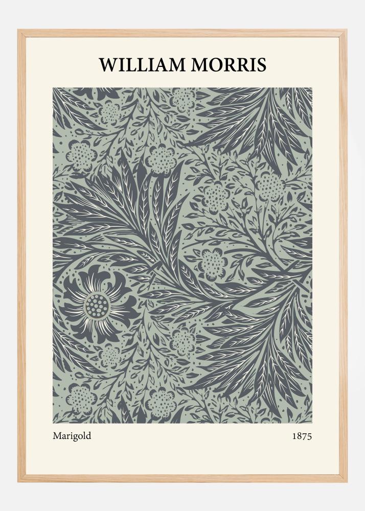 Ovaj William Morris plakat, sa svojim očaravajućim uzorkom "Marigold" iz 1875. godine, pokazuje Morrisovu jedinstvenu sposobnost kreiranja detaljnih i harmoničnih botaničkih ilustracija. Motiv je pun života i pokreta, sa svojim vijugavim lišćem i cvijećem koji kao da izrasta iz samog papira. Boje, u umirujućim tonovima zelene i tamnijim akcentnim nijansama, stvaraju elegantan i ujedno prirodan dojam.