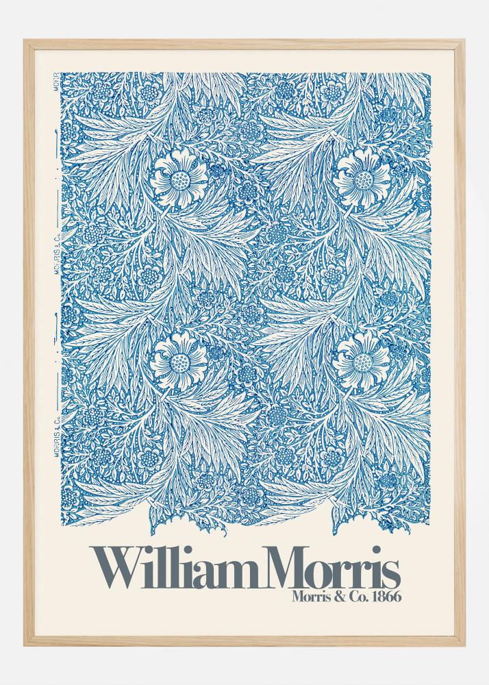 Ovaj poster prikazuje klasičan uzorak Williama Morrisa pod nazivom "Marigold", stvoren od strane Morris & Co. oko 1866. godine. Ikonični uzorak, poznat po svojim složenim i prirodom inspiriranim elementima, izrađen je u tamno plavoj boji na čistoj, krem pozadini. Svaki detalj u cvjetnom aranžmanu pažljivo je izrezbaren, što pokazuje Morrisov osjećaj za ljepotu u prirodnom i sposobnost pretvaranja istog u umjetnička djela koja su bezvremenska i voljena i danas.