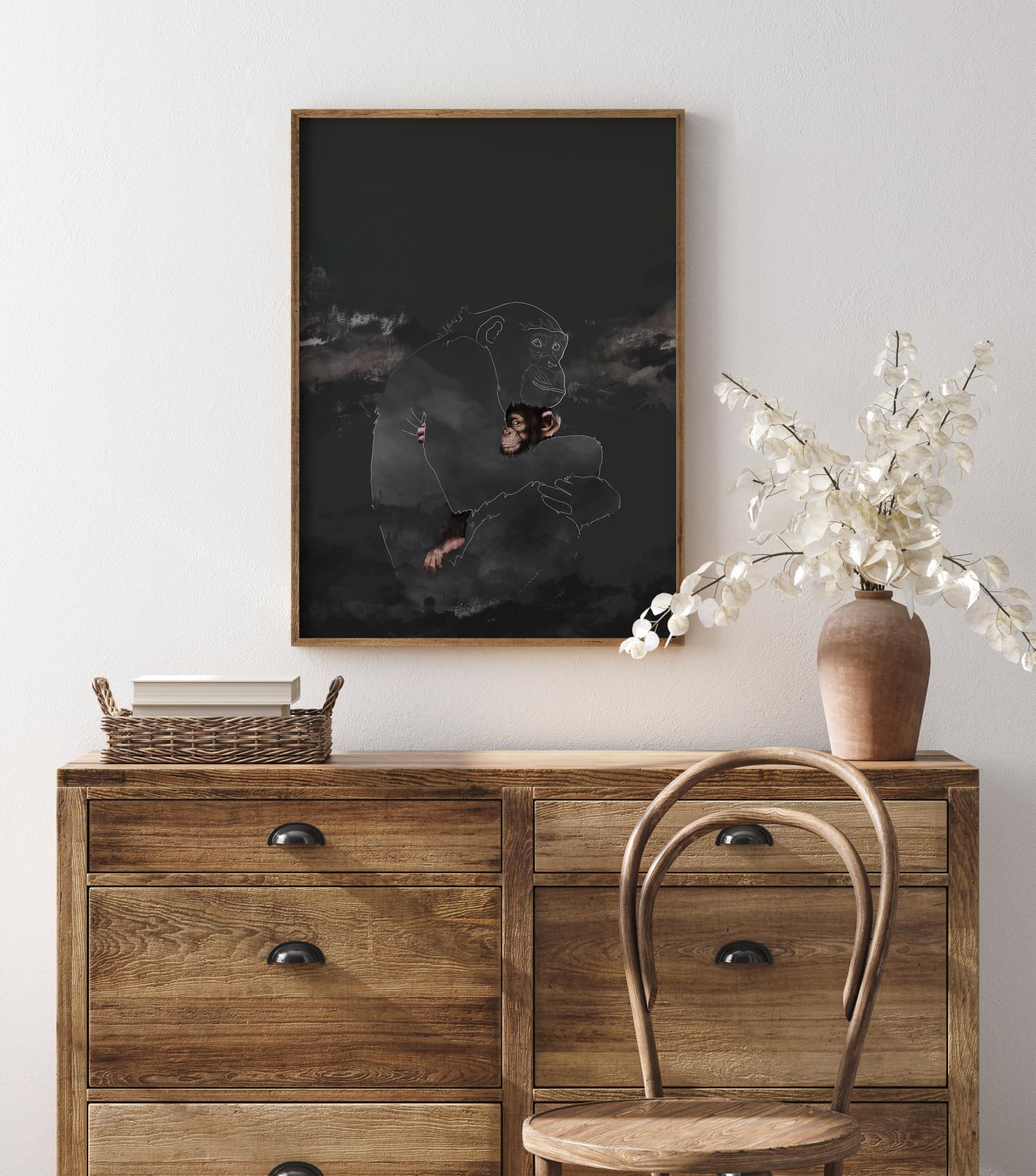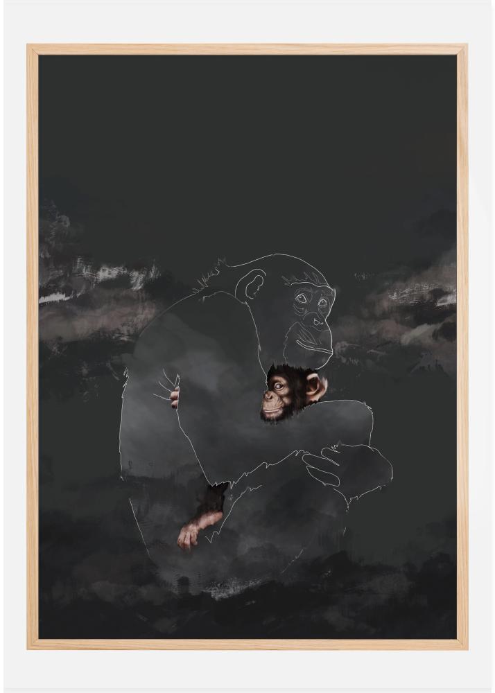 Emotivni poster s mladuncem čimpanze koji grli izgubljenu sliku svoje majke. Ovo je dirljiva slika kada mladunac čimpanze grli ništa drugo nego konture svoje majke koja sjedi na mekim oblacima na crnom nebu.