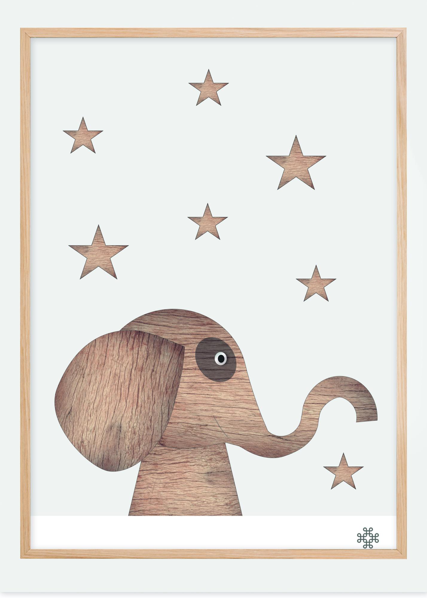 Plakat s dizajnom drveta s ljupkim slonom okruženim zvijezdama. Slon je izrađen od kolaža s drvenim uzorkom koji mu daje strukturni efekt. Zvijezde su postavljene oko slike kako bi stvorile ovu domišljatu sliku koja će biti pozitivan i veseo dodatak svakoj dječjoj sobi.