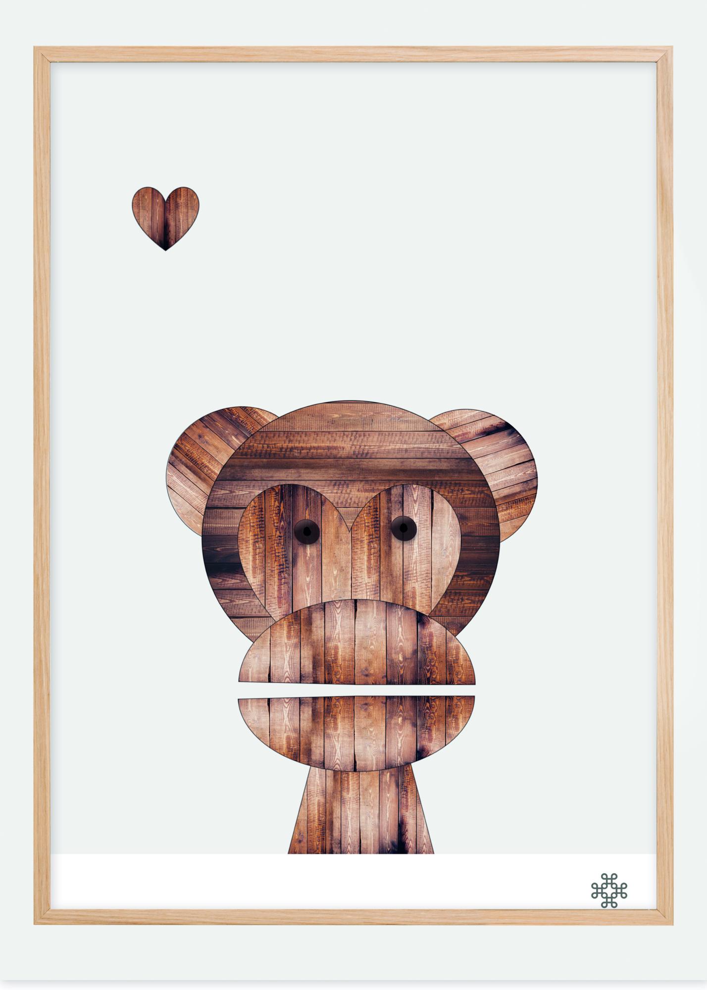 Poster s drvenim daskama gdje drvo tvori oblik malog majmuna. Iznad majmuna je malo srce. Majmun te gleda sa slike i daje ti svu ljubav. Ovaj mali ljubavni majmun je lukav i čudan i savršena je opcija za uređenje dječje sobe.