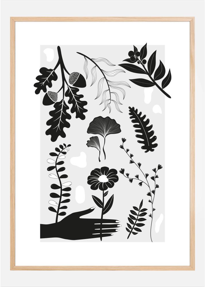 Odvažan poster s crno-bijelim figurama različitih listova, biljaka i cvijeća. Crna ruka pruža se kako bi uhvatila jedan od stiliziranih cvjetova. Žirovi, cvjetovi, paprati i drugo ispunjavaju ovaj jednostavan ali zanimljiv ispis. Dovedite se u botaničko raspoloženje kada objesite ovaj biljni poster u svom domu.