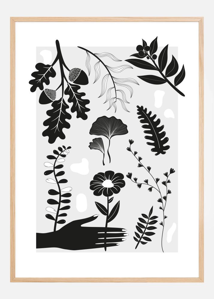 Smjela poster s crno-bijelim figurama različitih listova, biljaka i cvijeća. Crna ruka pruža se kako bi uhvatila jedan od stiliziranih cvjetova. Žir, cvjetovi, paprat i drugo ispunjavaju ovaj jednostavan ali zanimljiv tisak. Dovedite se u botaničko raspoloženje kada objesite ovaj biljnu poster u svom domu.