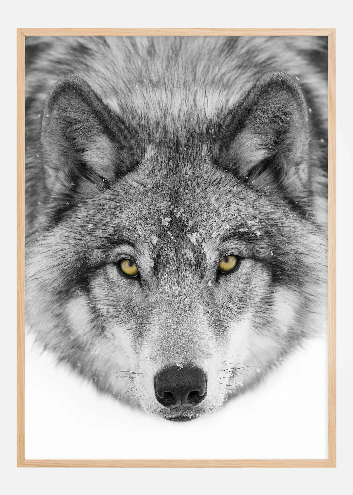 Ovaj dojmljivi poster prikazuje krupni plan vuka, gdje je žarište na životinjskim prodornim žutim očima protiv snijegom prekrivene pozadine. Detaljna vučja dlaka i pahulje koje su lagano pale na nju pružaju osjećaj njezinog prirodnog staništa i ljepote divljeg života.
