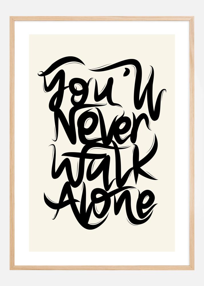 Ovaj snažan poster prikazuje razigranu i umjetničku kaligrafiju fraze "You Never Walk Alone" u crnom tekstu na toploj, kremastoj pozadini. Tekući i dinamičan stil tipografije prikazuje riječi koje su isprepletene, stvarajući izraz pokreta i zajedništva. Dizajn vješto balansira između čitljivosti i umjetničke slobode, čineći tekst i nositeljem poruke i estetskim objektom samim po sebi.