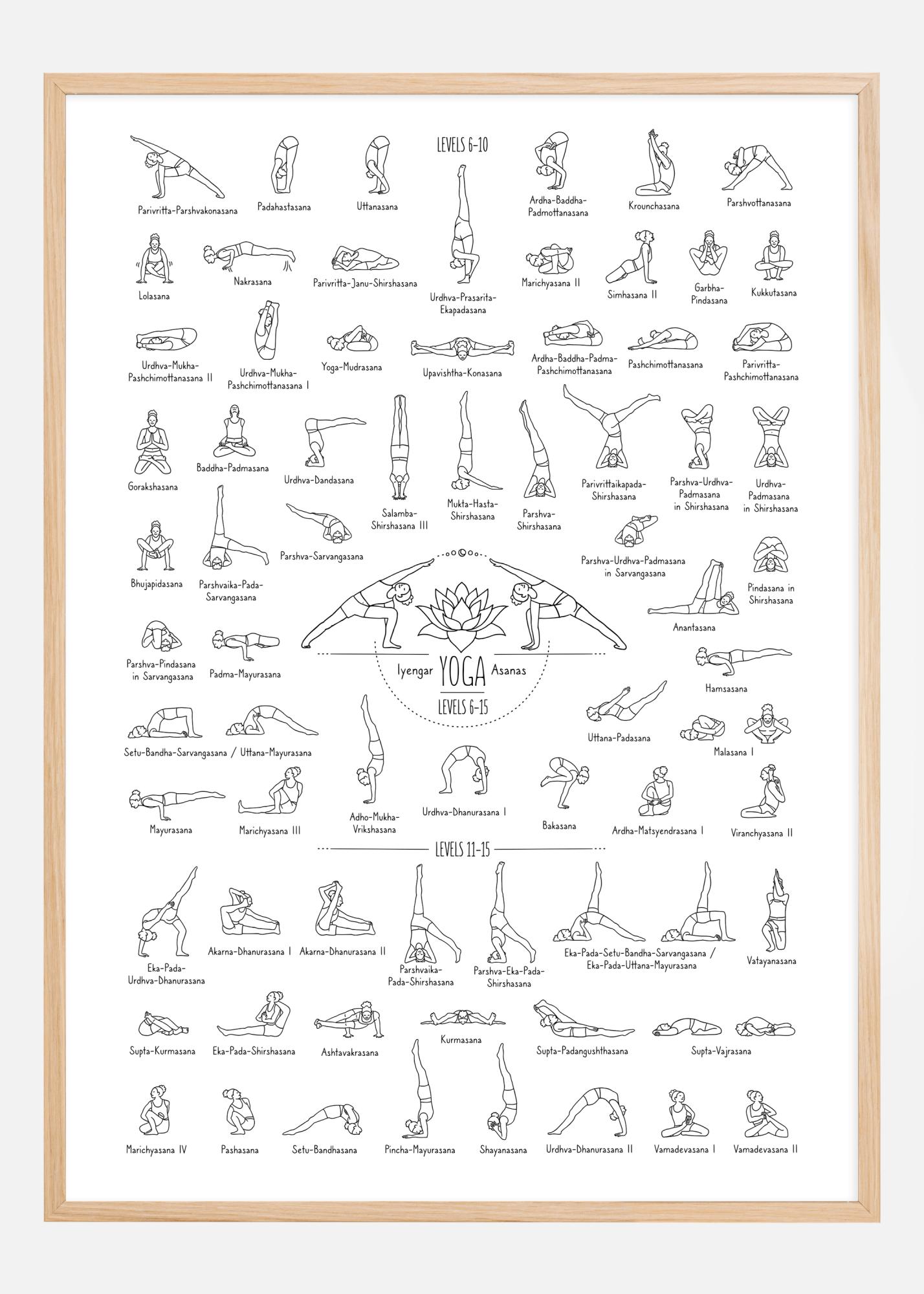 Ovaj opsežan i poučan poster pruža vizualni vodič za Iyengar Yoga Asane za nivoe od 6 do 15, predstavljen u jasnom i metodičkom izgledu. Detaljne ilustracije su prikazane s preciznim linijama koje ističu jedinstvene oblike i položaje u svakoj joga pozi. Iznad svake slike nalazi se ime asane na sanskrtu, što omogućuje praktikantima svih razina da lako identificiraju i vježbaju svaki položaj.