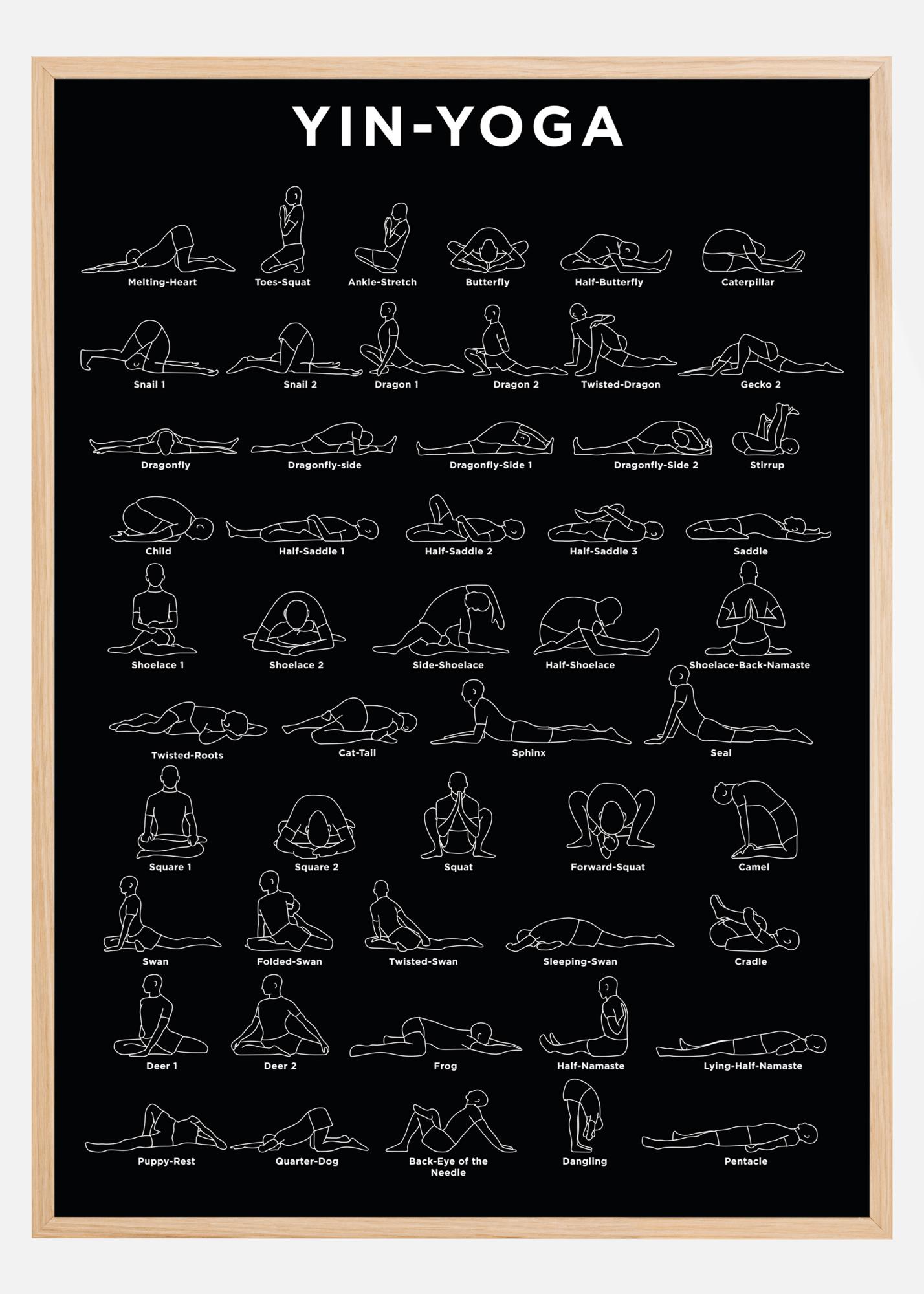 Pomoćni poster s različitim položajima koje možete raditi u jogi. Pogledajte ovu crnu sliku sa svakim položajem yin joge nacrtanim kao jednostavna bijela figura. Naučite različite položaje s lakoćom dok mala figura pokazuje kako ih izvesti. Postanite fleksibilni ove godine kada počnete istezati se zahvaljujući ovom ispisu!