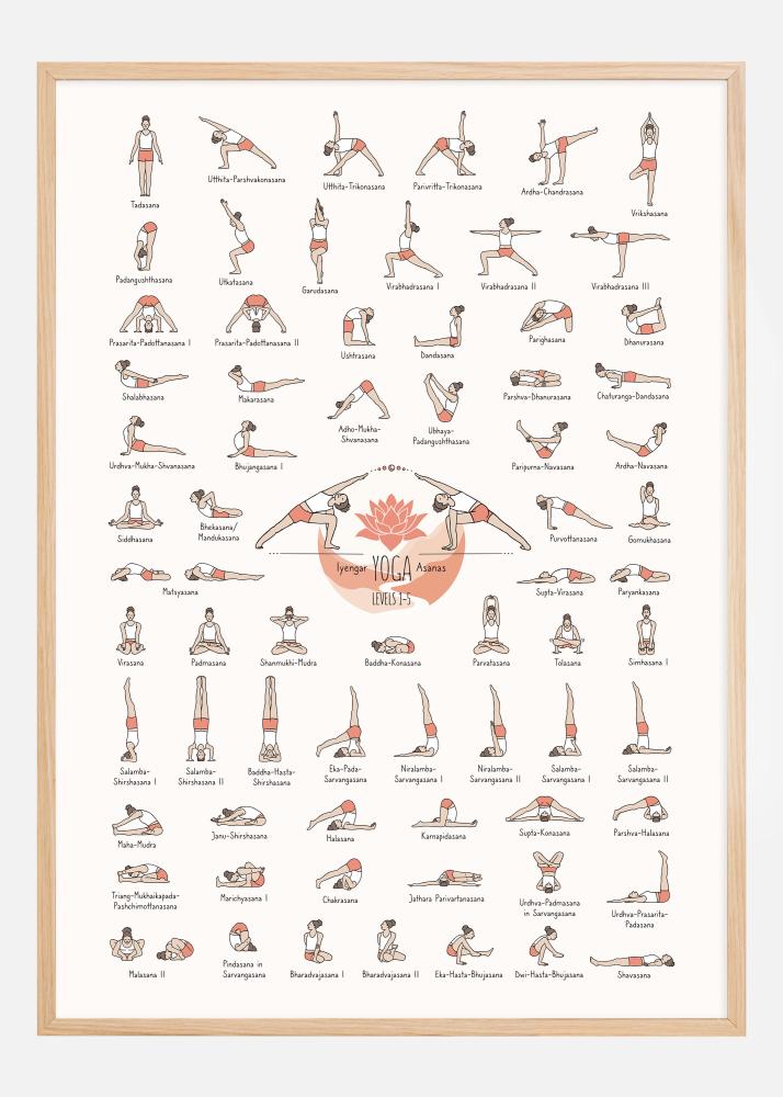 U središtu postera ističe se naslov 'Iyengar YOGA Asanas' okružen stiliziranim cvijetom lotosa, simbolom čistoće i duhovnog buđenja u yogi. Ovaj poster kombinira praktične informacije s estetski privlačnim izgledom, što ga čini savršenim dodatkom svakom yoga studiju, kućnoj praksi ili kao dio uređenja inspiriranog zdravim načinom života. Blage boje omogućuju posteru da bude i fokusna točka i harmoničan dio ostalog dizajna prostorije.