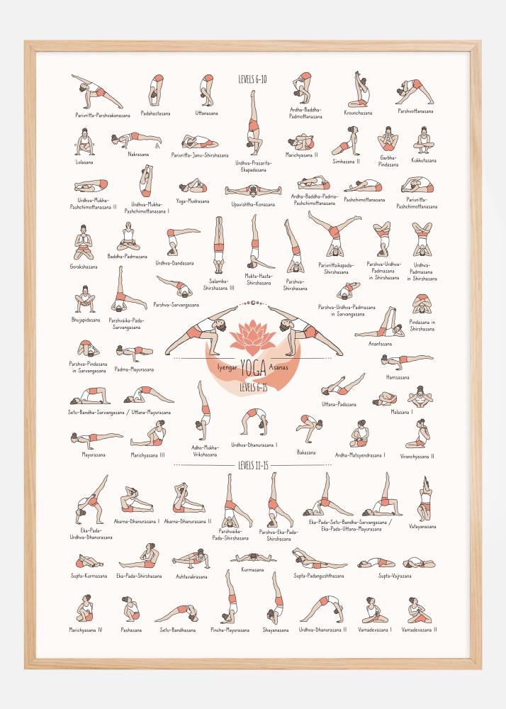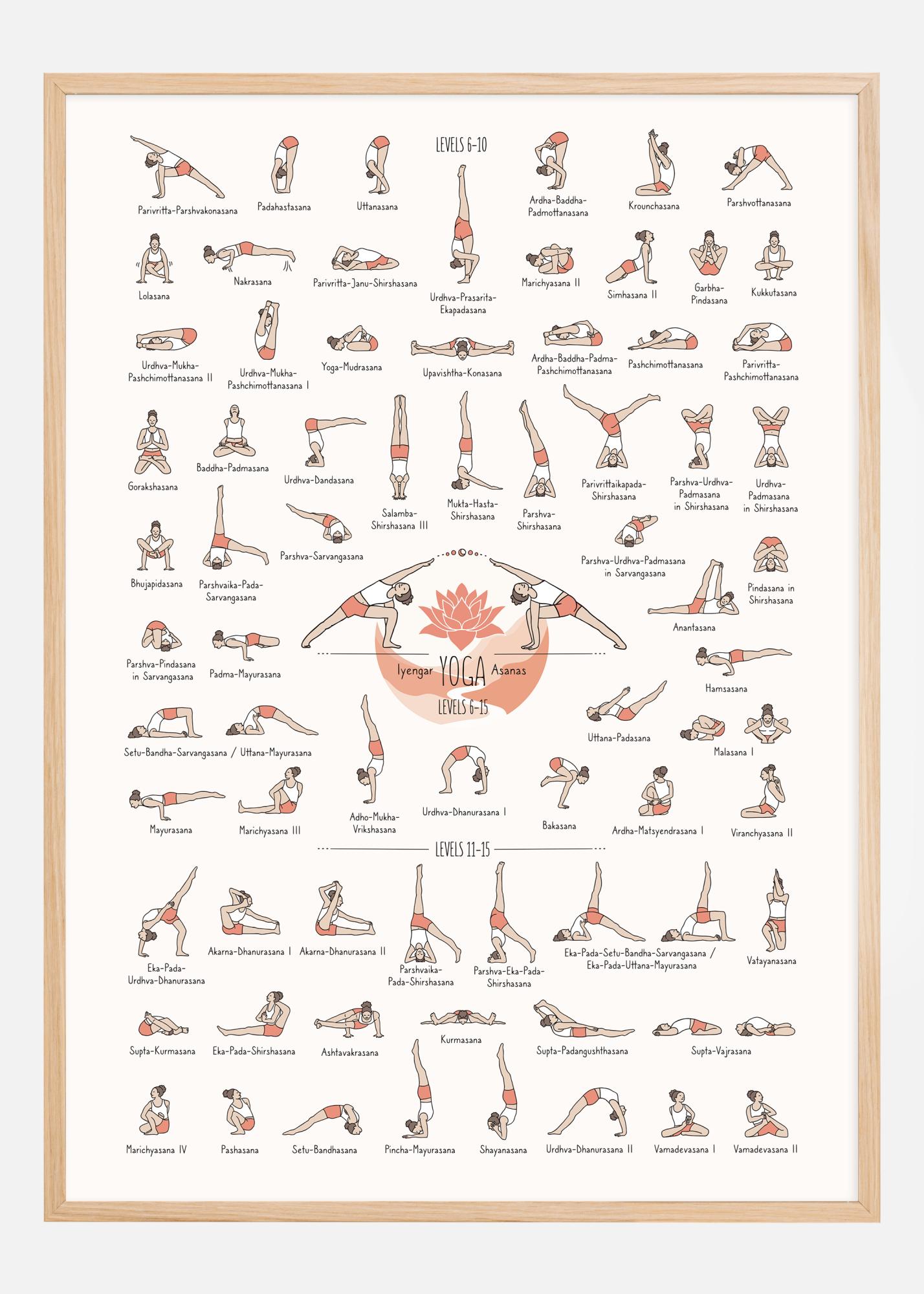 Ovaj detaljan i šareni plakat za jogu ilustrira sveobuhvatan skup Iyengar Yoga asana od razine 6 do 15. Svaka joga poza je fino ilustrirana s toplim, ugodnim bojama koje ističu svaku formu i gestu, dok jasno prepoznatljiva imena pored svake ilustracije olakšavaju praćenje i vježbanje. Dizajn je i funkcionalan i estetski, stvarajući ugodnu atmosferu za vježbače joge svih razina znanja.