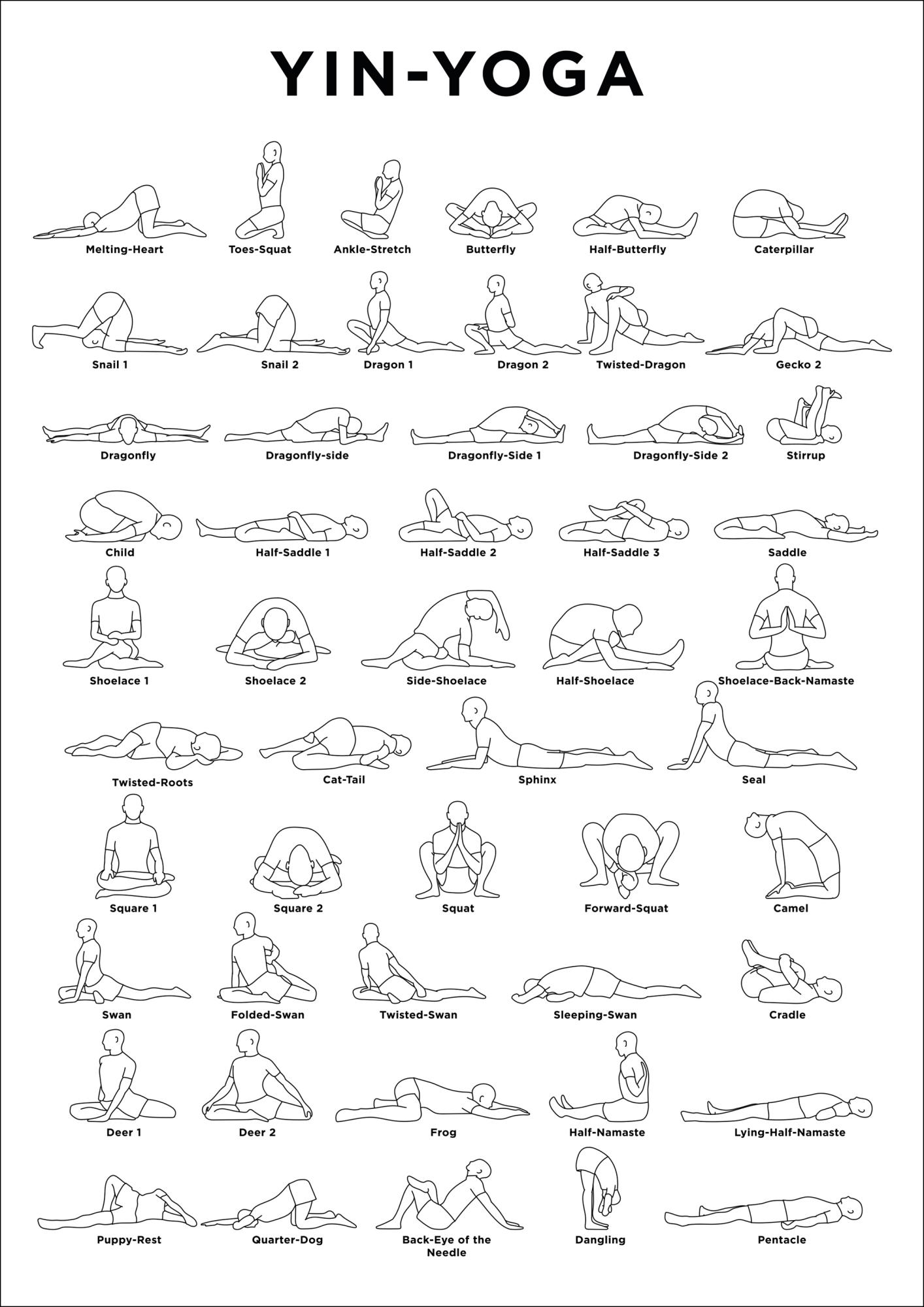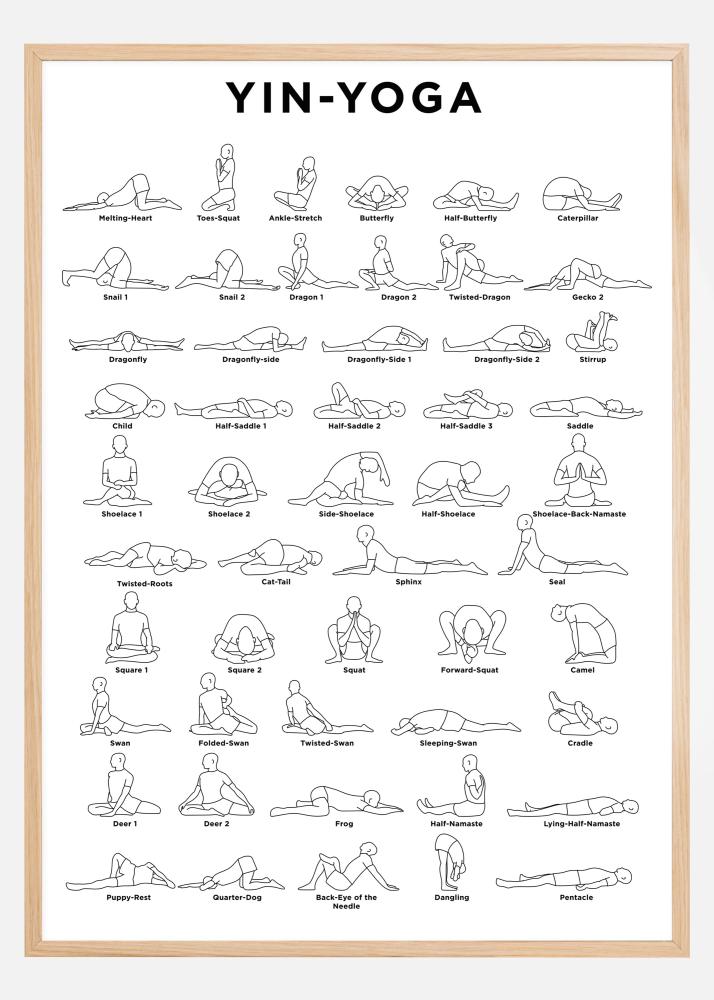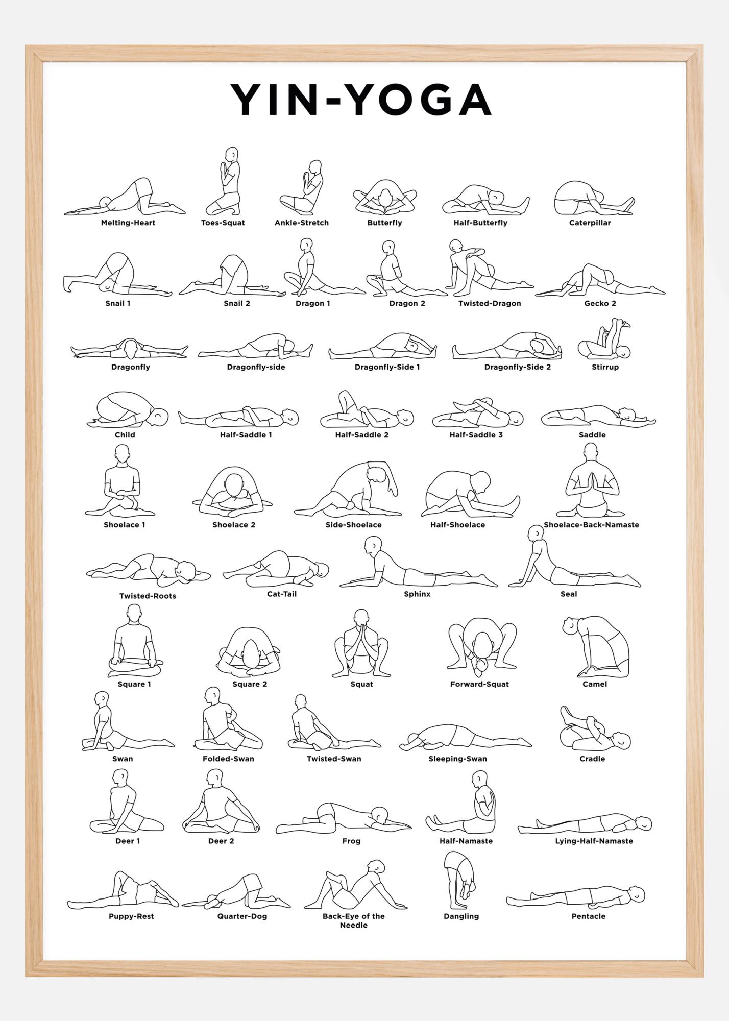 Zabavan dizajnerski poster koji prikazuje različite yoga pozicije koje možete naučiti. Bijela slika ima svaku figuru nacrtanu crnom bojom u sjedećim ili ležećim pozama, s imenom ispod. Objesite ga negdje gdje ga možete vidjeti u svom domu i pratite svaku pozu kako biste se pravilno istegnuli.