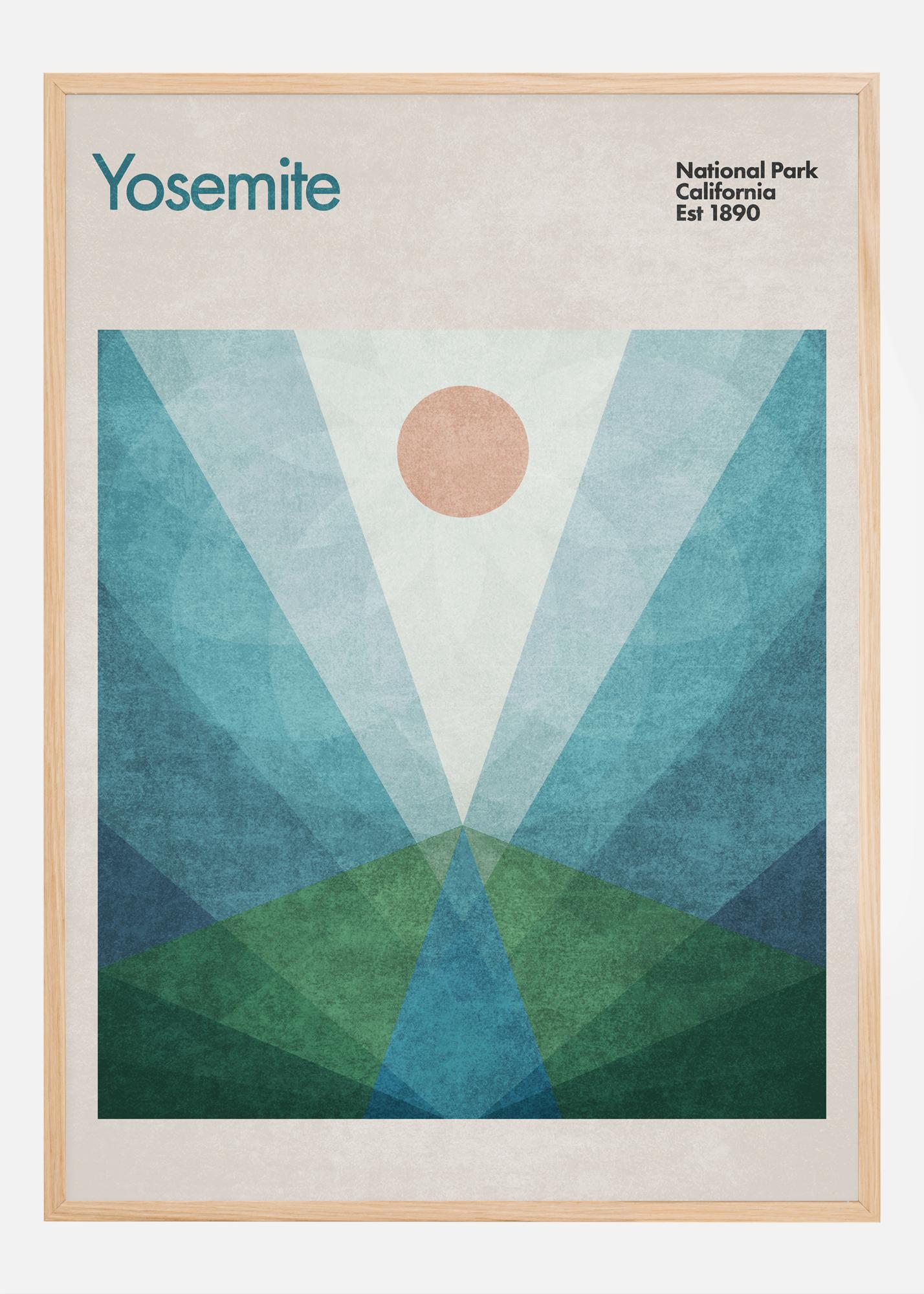 Ovaj poster hvata duh Nacionalnog parka Yosemite s geometrijskim dizajnom koji odražava veličanstvene i ikonične krajolike parka. S paletom boja koja podsjeća na čisto nebo i bujne doline, tekst "Yosemite National Park California Est 1890" slavi dugu povijest parka kao nacionalnog parka i prirodne blaga.