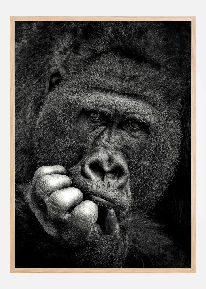 Fantastičan portretni poster gorile u kontemplativnoj pozi. Gorila gleda s nefokusiranim pogledom prema kameri. Jedna ruka je savijena ispod brade kao da razmišlja o važnim pitanjima. Crno-bijeli otisak ističe sve detalje na licu ove potpuno nevjerojatne čovjekolike majmuna.