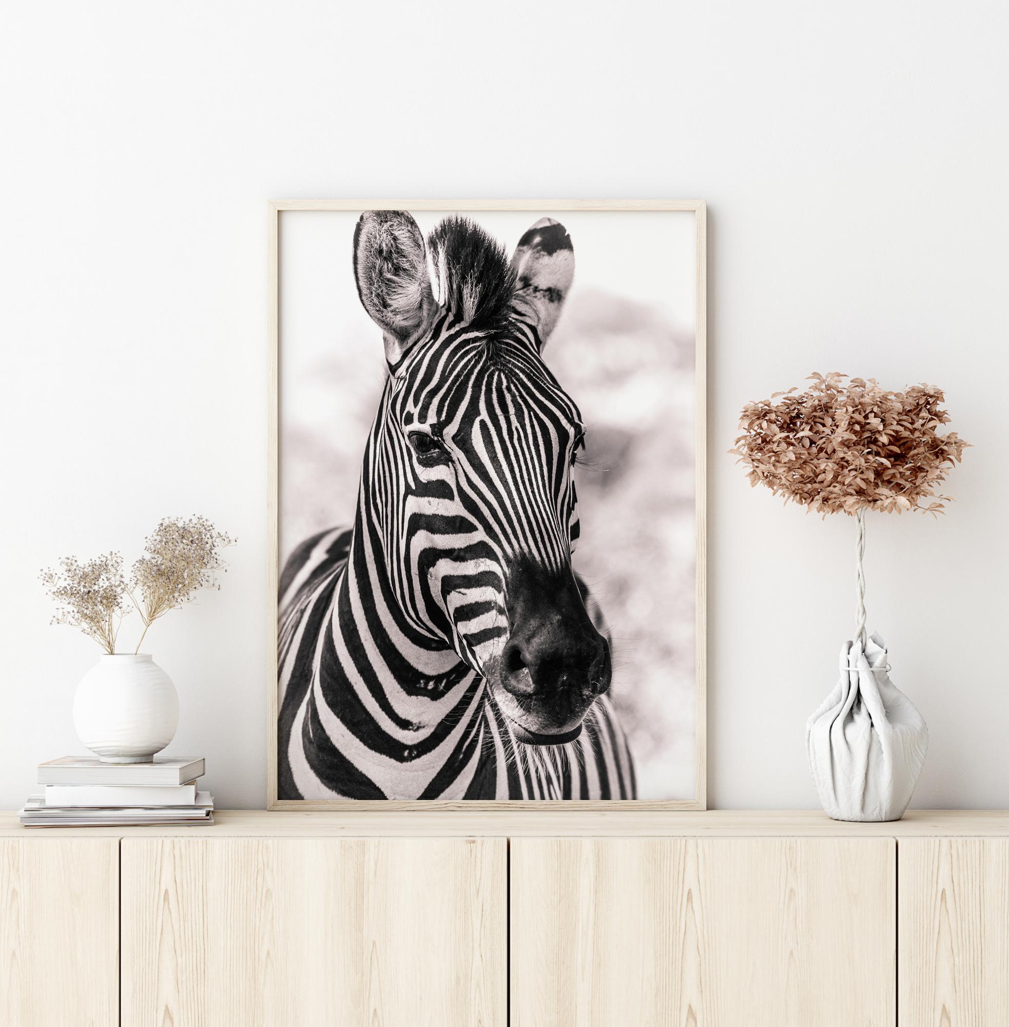 Poster sa životinjama sa zebrom koja gleda prema kameri. Zebra izgleda opušteno dok stoji mirno s jednim uhom naprijed i drugim unazad. Uživajte u crno-bijelim uzorcima ove slatke životinje i kombinirajte je s omiljenom bojom na zidu kako biste dodali malo boje prugama.